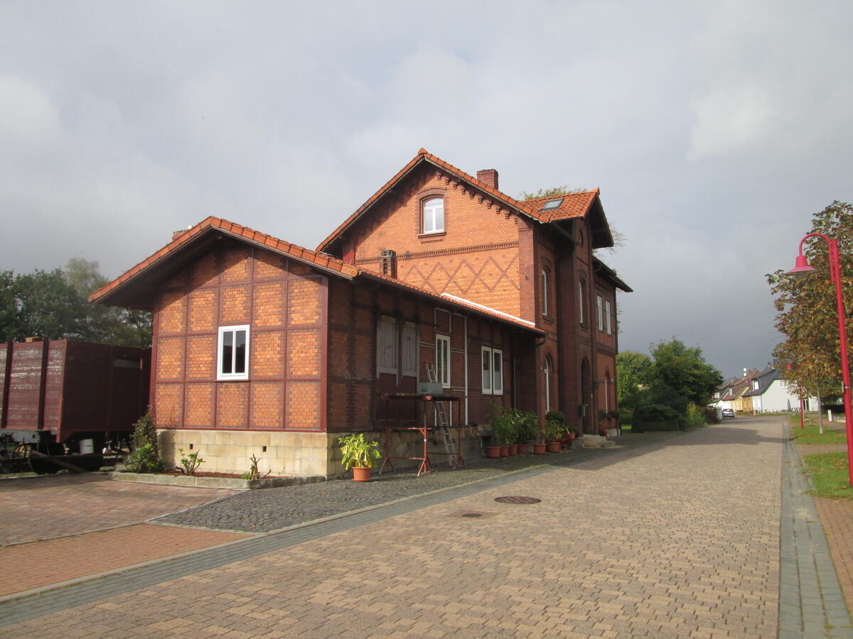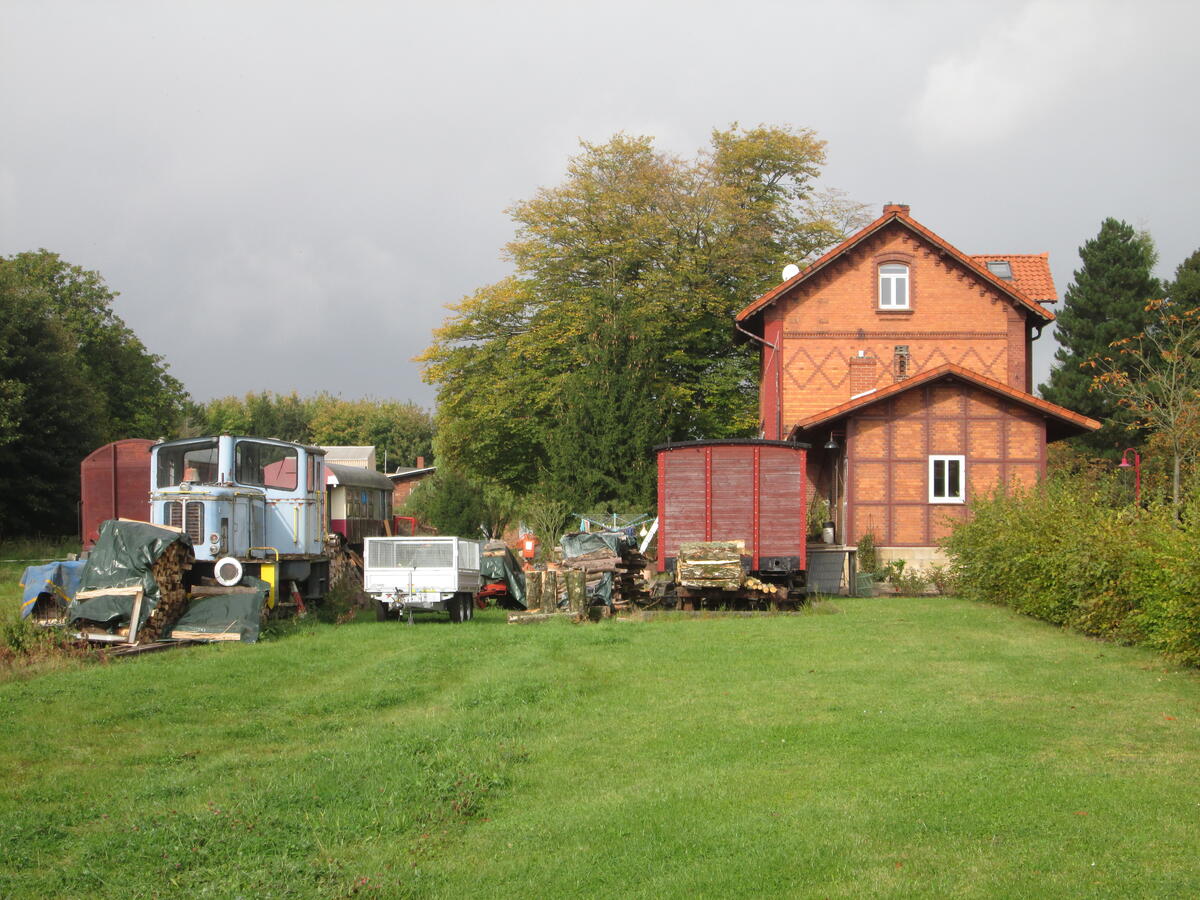 Das Bahnhofsgebäude wird heute als privates Wohnhaus genutzt. Auf dem zugehörigen Gelände stehen noch immer einige alte Loks und Eisenbahnwaggons.