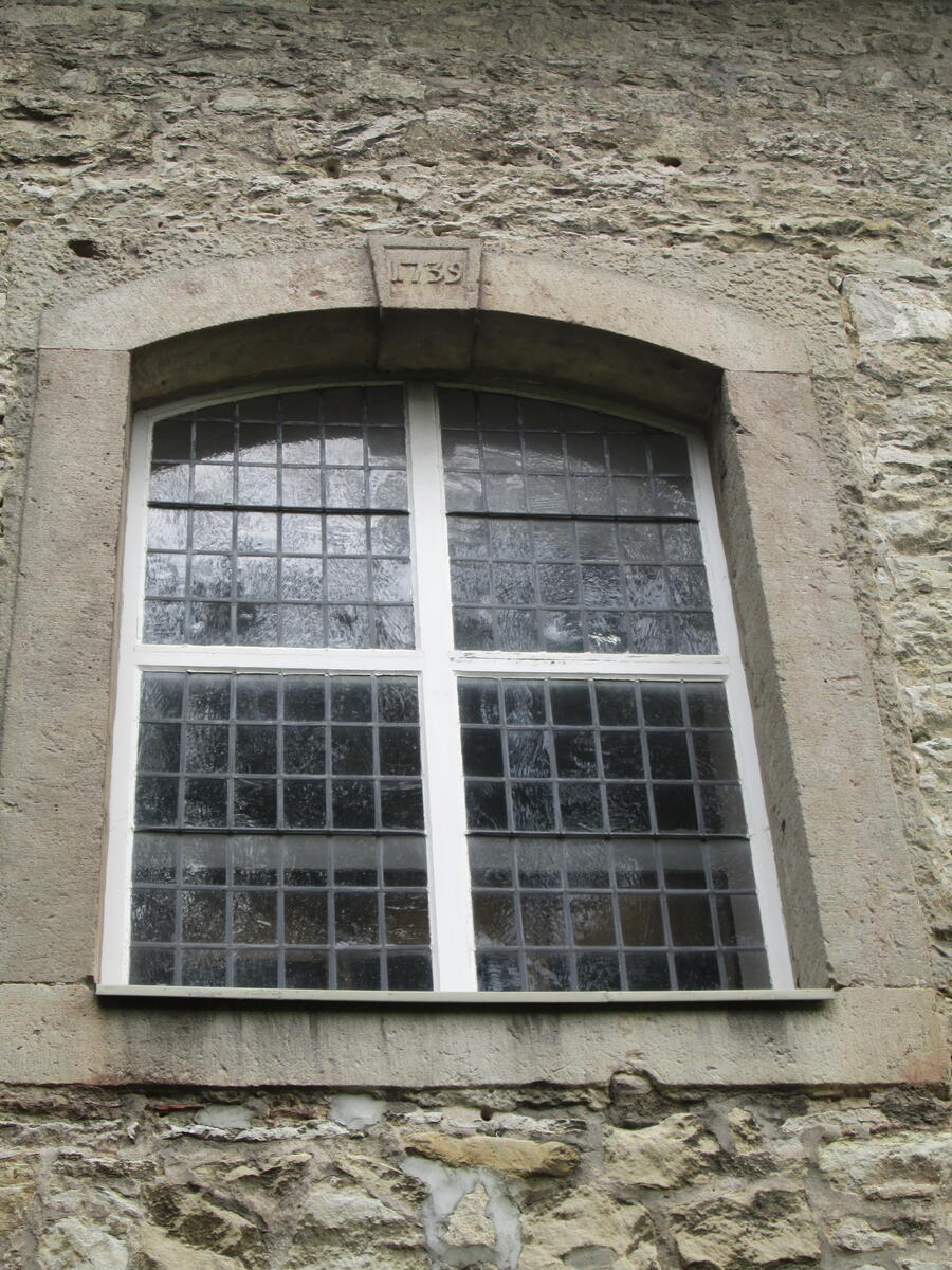 Das sechsachsige Kirchenschiff hat neben kleineren Fenstern über diesen beiden Türen auf jeder Längsseite fünf hohe Fenster, die nach oben leicht gerundet sind. Ein weiteres Fenster befindet sich auf der Ostseite der Kirche.
