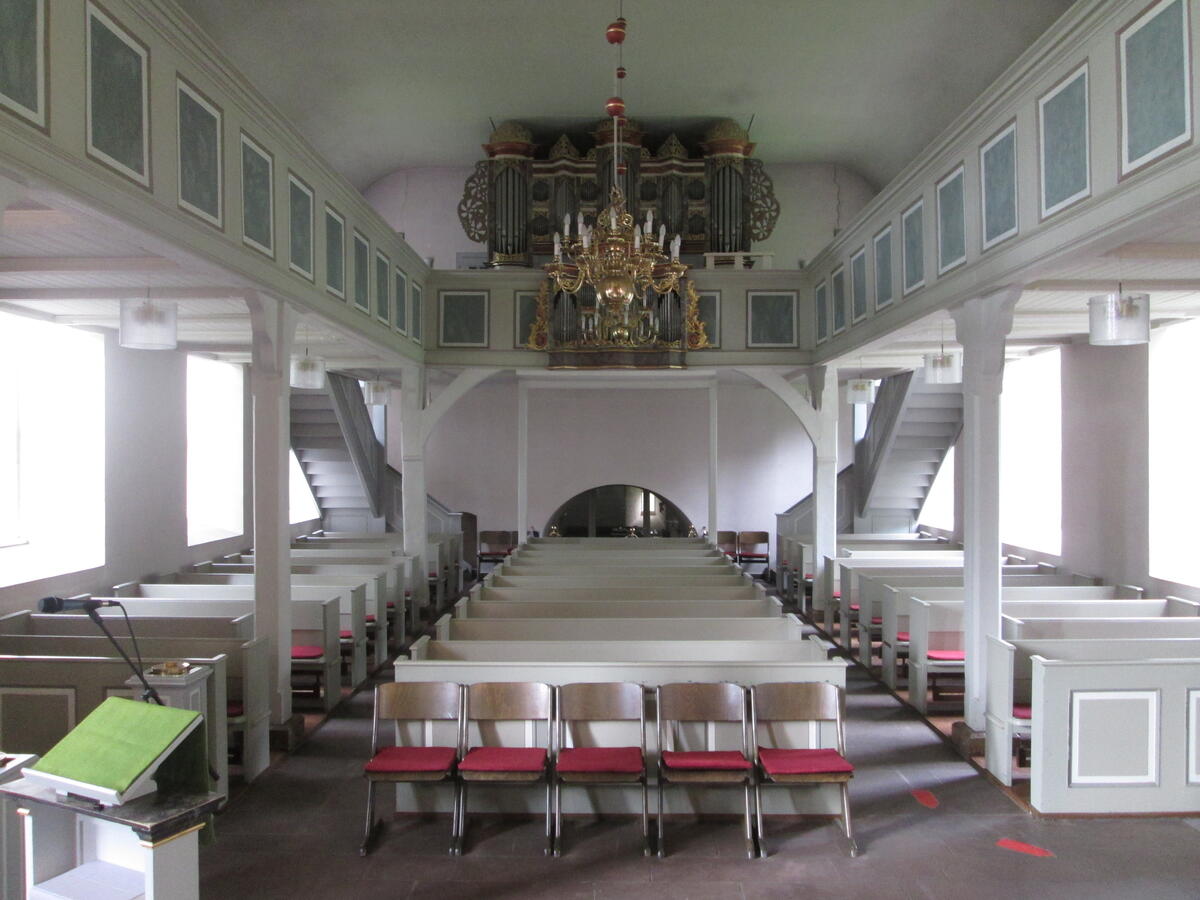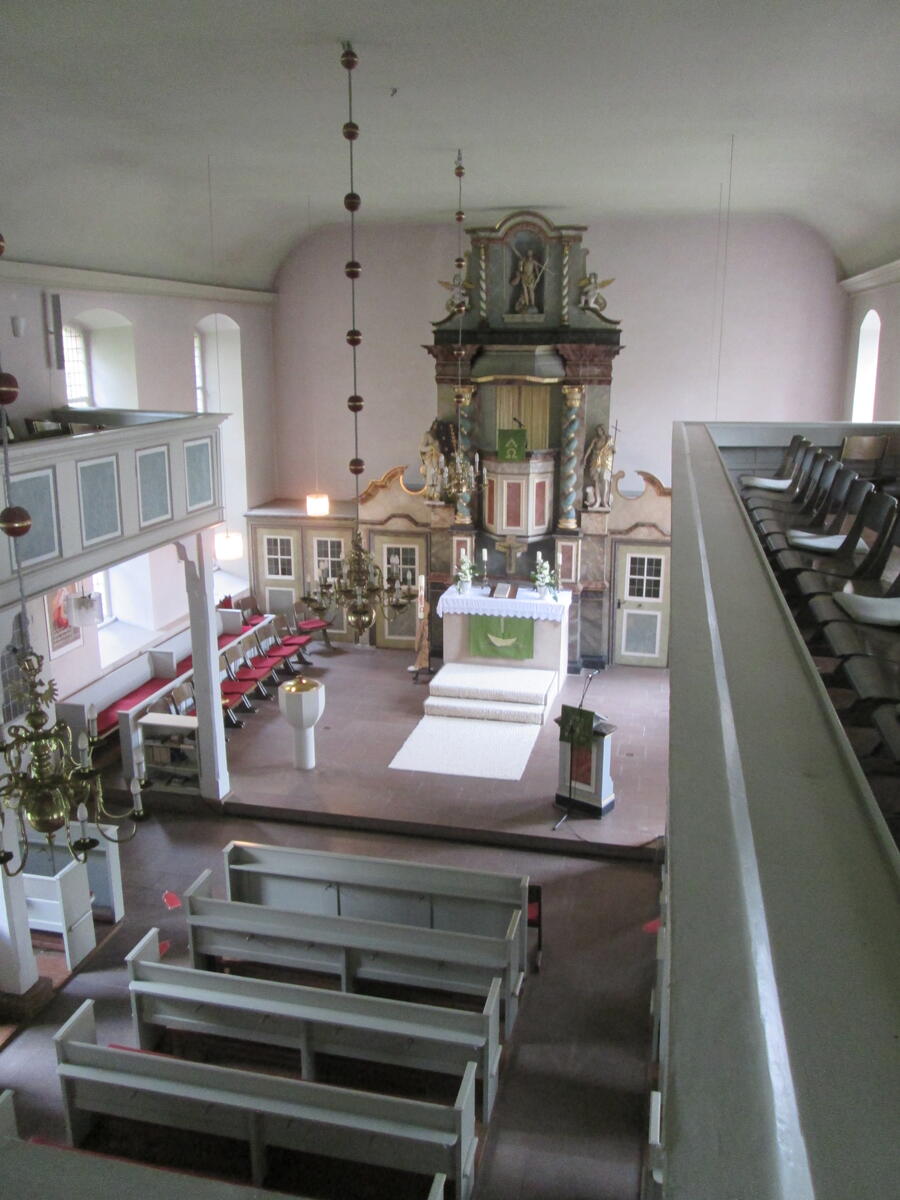 Über Kirchenschiff und Chorraum hängen drei barocke Kronleuchter, von denen einer im Jahre 1909 gefertigt wurde, die beiden anderen Leuchter Mitte des 18. Jh.