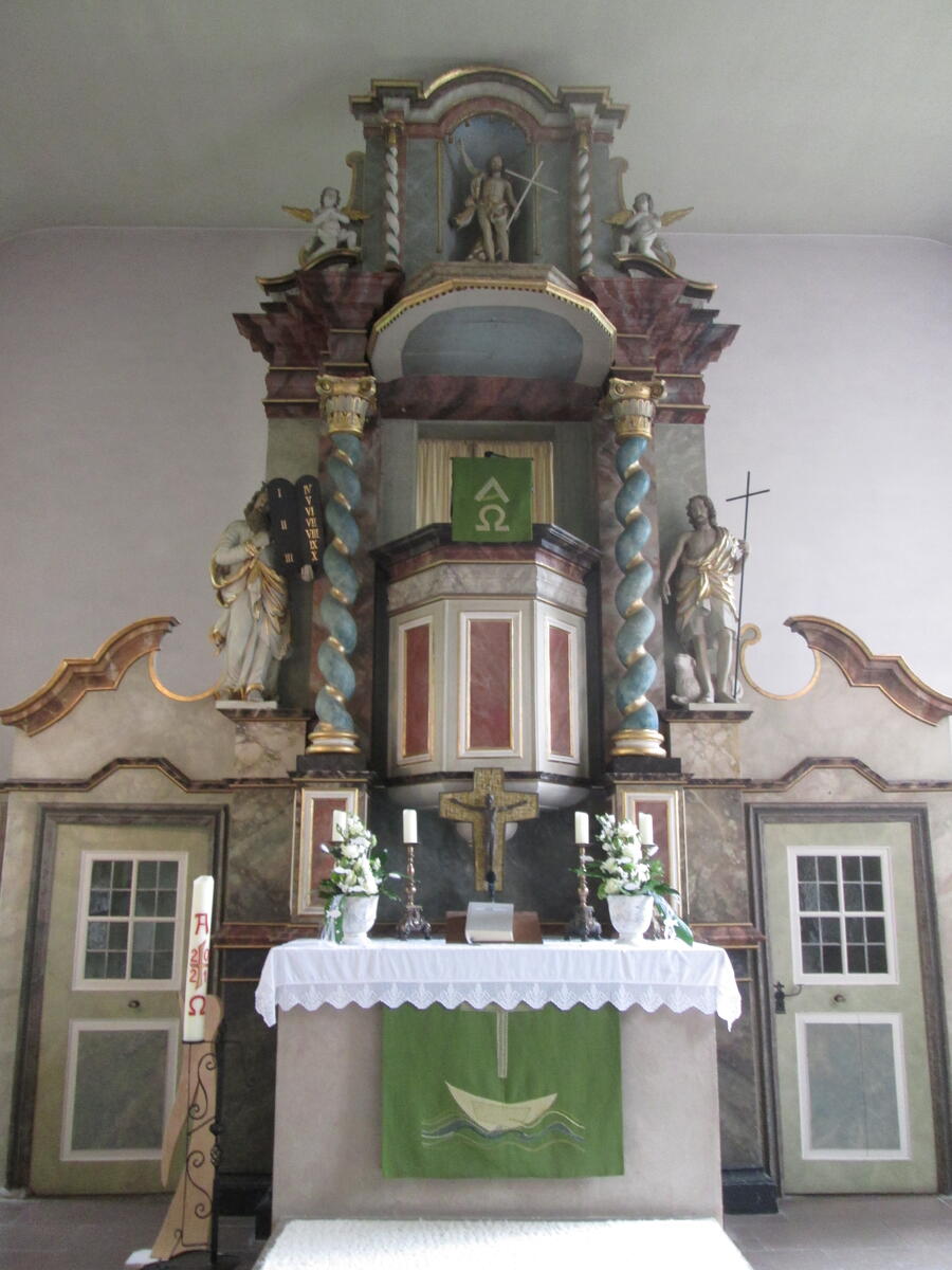 Man betritt die rechteckige Barockkirche über Eingangstüren im Norden und Süden.