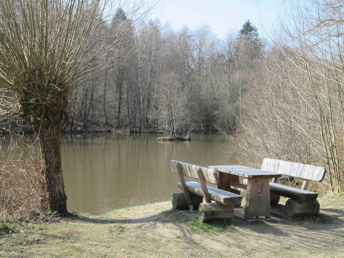 Am Wanderparkplatz findet man eine Tafel mit Informationen zum Pottland und seinen Wanderwegen, eine Sitzgruppe an einem der Teiche lädt zu einem Picknick ein.