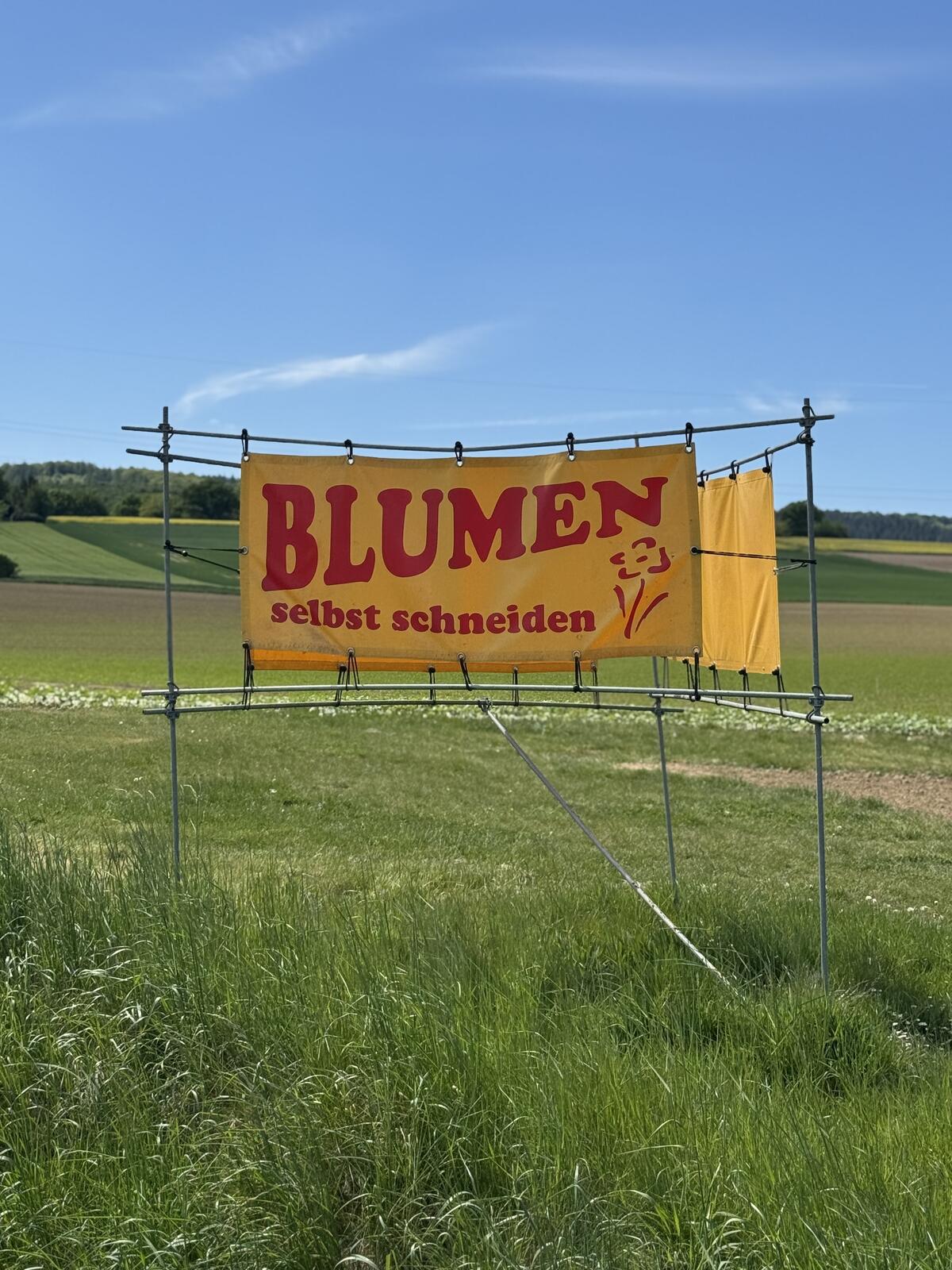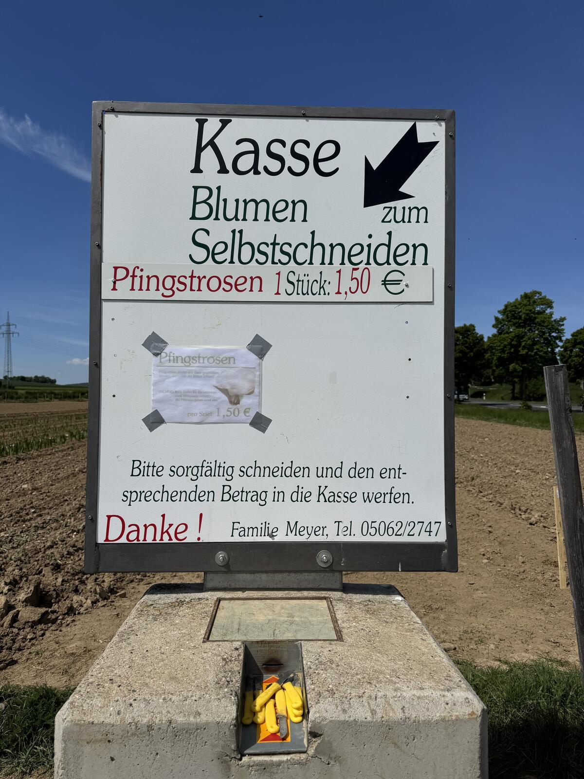 Gegenüber von Egenstedt liegt ein Feld, auf dem man in der Saison frische Blumen selbst schneiden kann – beispielsweise Pfingstrosen im Juni. Messer zum Schneiden liegen bereit, das Geld wird in eine bereitgestellte Kasse gelegt.