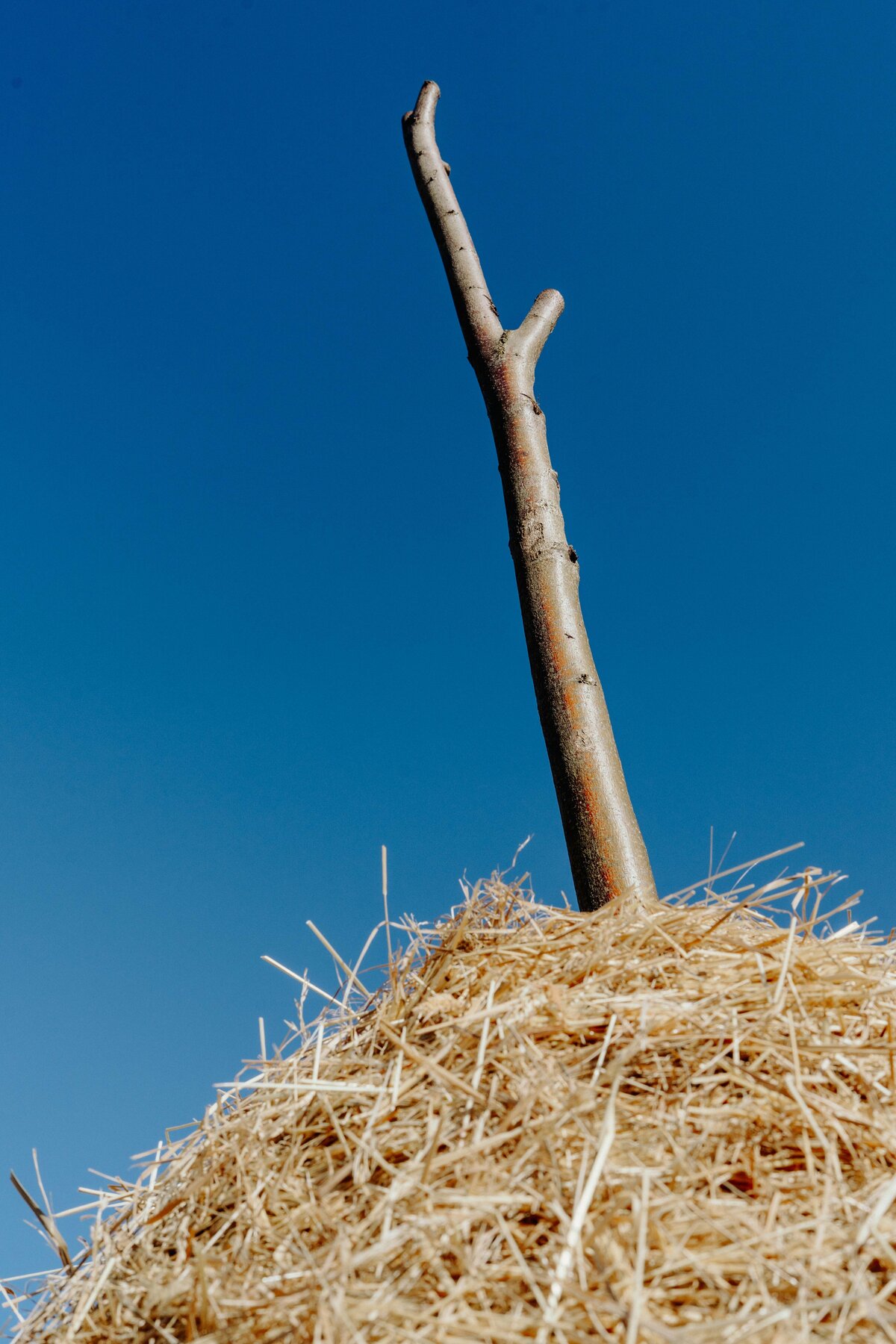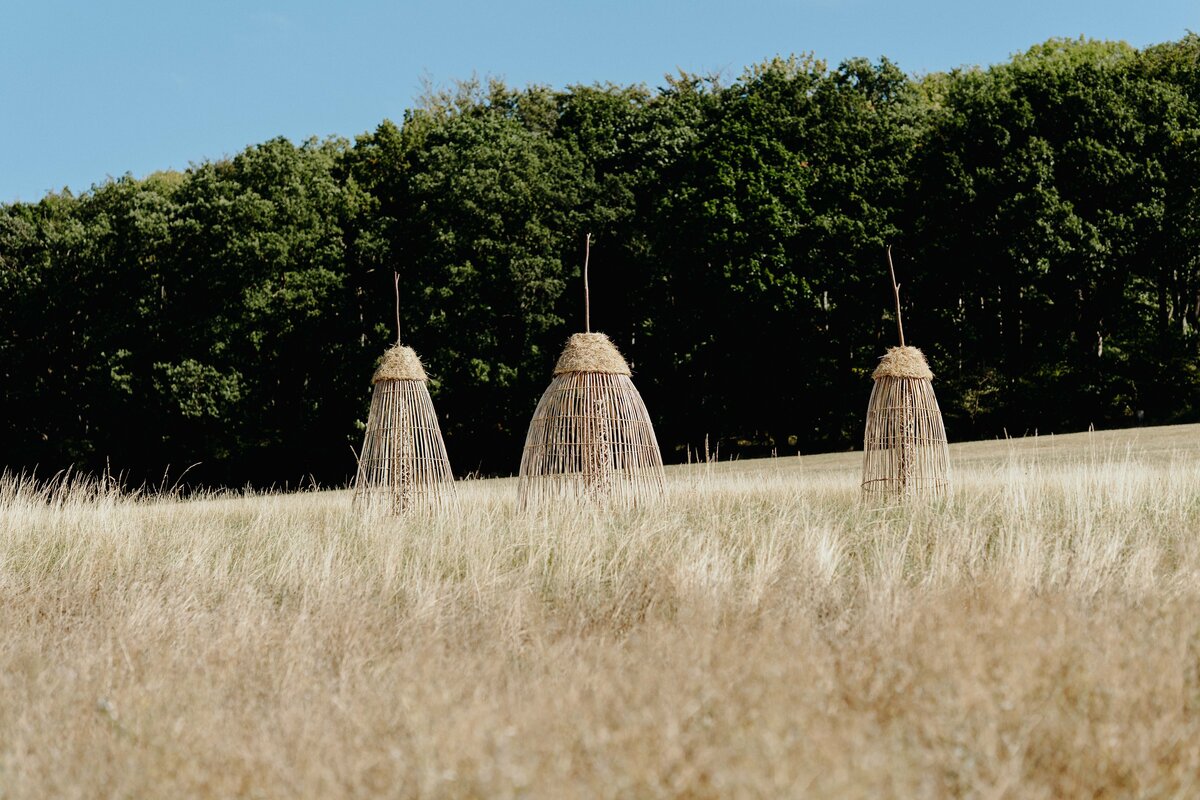 Mit Fata Morgana präsentiert die niederländische Künstlerin Karin van der Molen eine ortsspezifische Land Art-Installation, die in enger Verbindung zur Landschaft rund um Deinsen steht. Die Arbeit besteht aus drei transparenten Heuhaufenformen – stille, poetische Erinnerungen an die einst enge Beziehung zwischen Erde, Mensch und Tier. Früher waren Heuhaufen über die Felder verstreut: kleine Hügel voller Energie, gewachsen aus der Zusammenarbeit mit der Natur selbst.