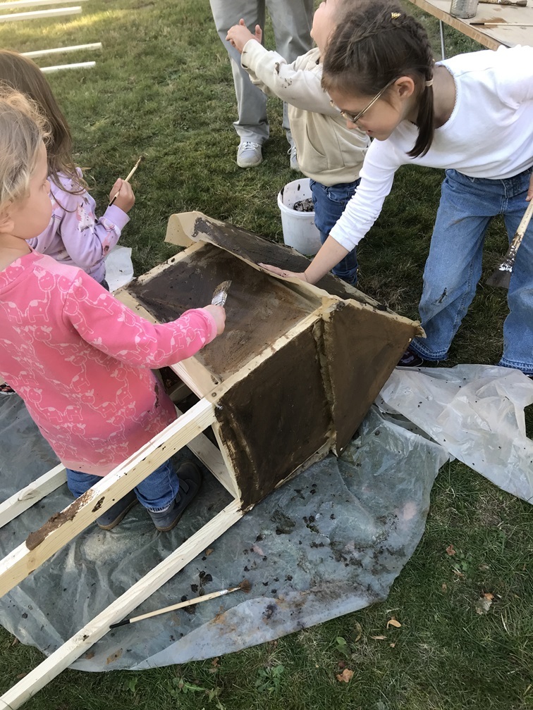 Hier waren die 'Erdhäuser' aus Latten gebaut, die mit wetterfesten Vliesen bespannt wurden. Kinder bemalten diese nun mit verschiedenen Erden aus der Region.