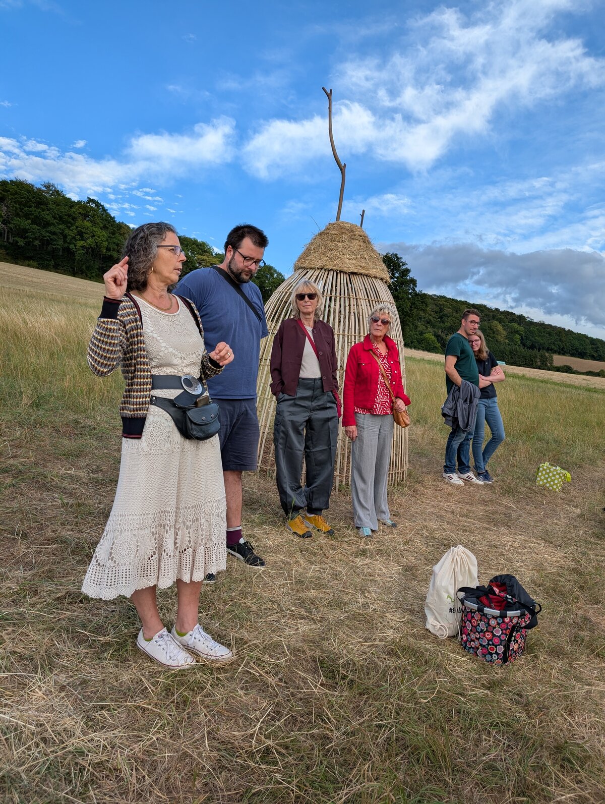 Nach einer kurzen Begrüßung durch Ortrud Michael, Dorfmoderatorin, gab Birgit Krauß vom Kulturbüro Hildesheim Einblicke in das Projekt. Anschließend erzählte Karin van der Molen, warum sie sich für dieses Werk entschieden hat: Die Arbeit besteht aus drei transparenten Heuhaufenformen, die wie stille Erinnerungen an vergangene Zeiten wirken. Einst prägten solche Heuhaufen die Felder der Region - Sinnbilder für das enge Miteinander von Mensch, Tier und Erde. Heute sind sie aus dem hiesigen Landschaftsbild verschwunden. In ihrer Installation tauchen sie neu auf: nicht mehr als praktische Objekte, sondern als fragile, durchscheinende Kunstwerke. Sie erscheinen flüchtig, fast unwirklich – wie eine Fata Morgana, die zugleich die Geschichte erzählt und den Blick für die Landschaft neu öffnet.