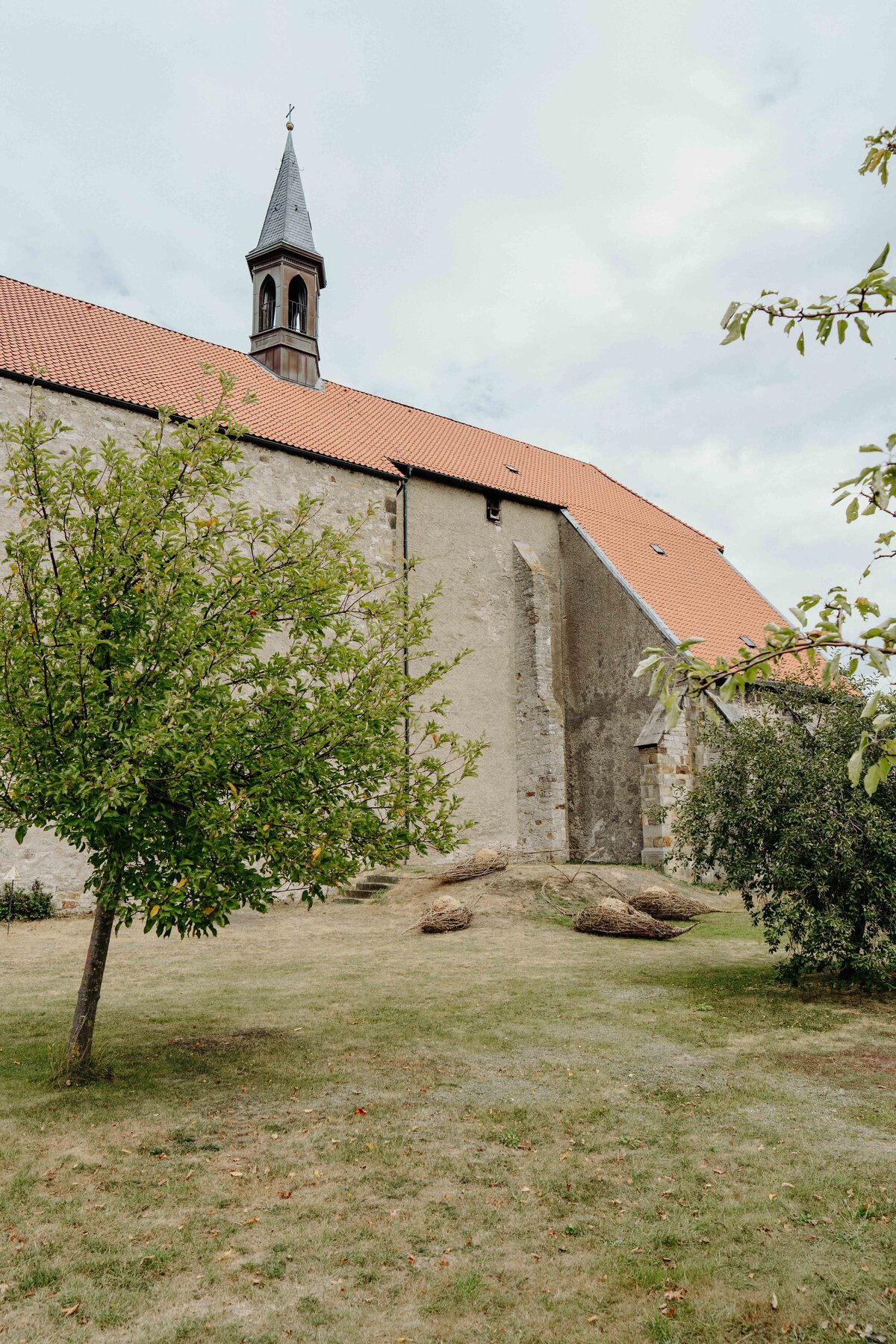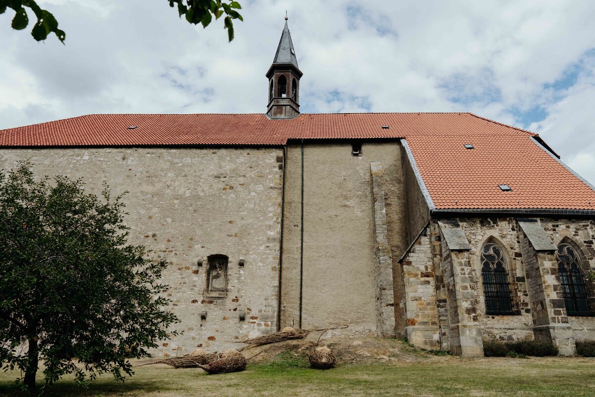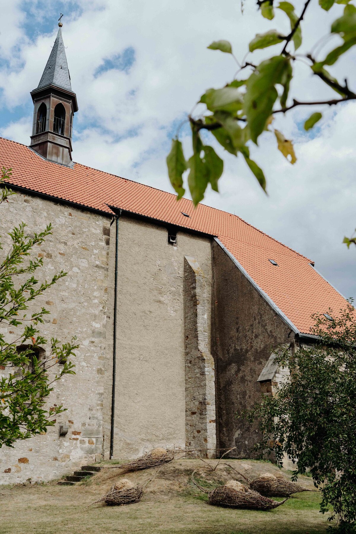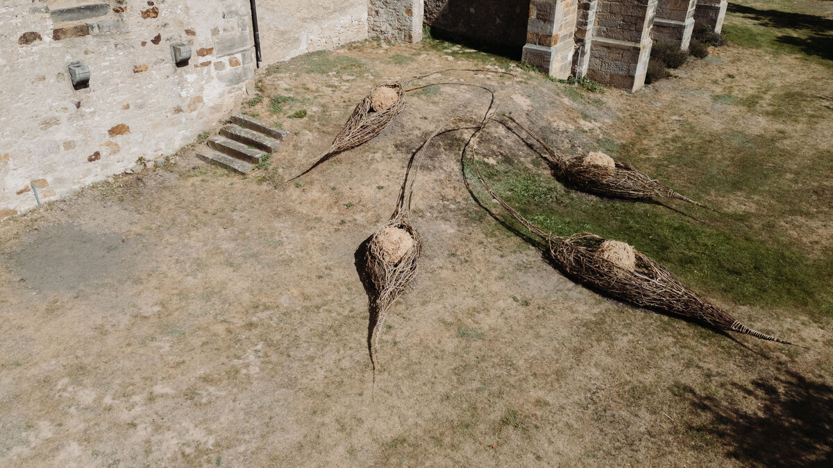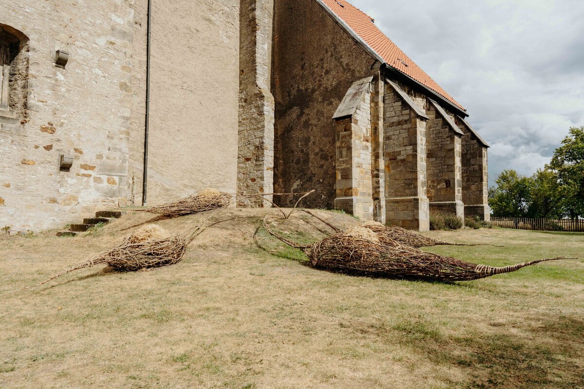 Die aus Naturmaterialien kreierte Installation von Anna und Michael Rofka an der Wittenburger Kirche mag auch an Schoten erinnern. Im Titel spielen sie aber auch mit den Assoziationen 'Bote' und 'Boote'. Auf jeden Fall sind es organische aus Zweigen geformte Objekte in denen sich Kugeln aus Zweigen und Gras befinden. Eingebettet sind sie in verschieden farbige Erden. Die einzelnen Elemente sind miteinander verbunden. Auch wenn sie an pflanzliche Gebilde erinnern bieten sie keine direkte begriffliche Entsprechung, auch wenn sie von Samenformen inspiriert sind. Vielmehr sind sie ein Fantasieprodukt, dass natürliche Materialien in einen neuen Sinnzusammenhang bringt.
