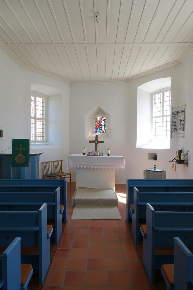 Der Innenraum der Deilmisser Kapelle ist mit weiß gestrichenen Wänden hell und schlicht gestaltet. Das einzige farbige Fenster ist das kleine im Osten über dem Altar, in dem Christus und Maria Magdalena dargestellt sind.