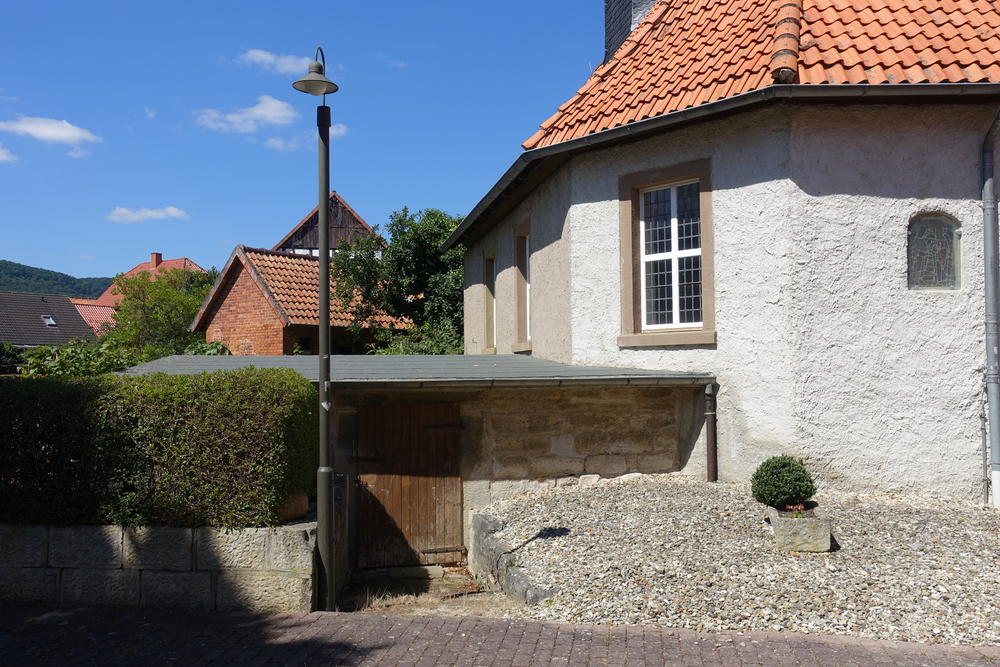 Der Kirchenbau ist nach Osten unregelmäßig geschlossen. Die Eingangstür auf der Nordseite und die Fenster sind schlicht rechteckig und mit Sandsteingewänden eingefasst. Auf der Südseite befindet sich ein ehemals als Leichenhaus dienender Anbau aus dem 19. Jh., der zum Teil kellerartig in den Boden eingelassen ist. Auf älteren Fotos ist zu sehen, dass das kleine Leichenhaus früher ein Satteldach hatte, dessen Dachfirst bis knapp unter die Regenrinne des Kirchendaches reichte. Das Leichenhaus wird heute als Keller genutzt.