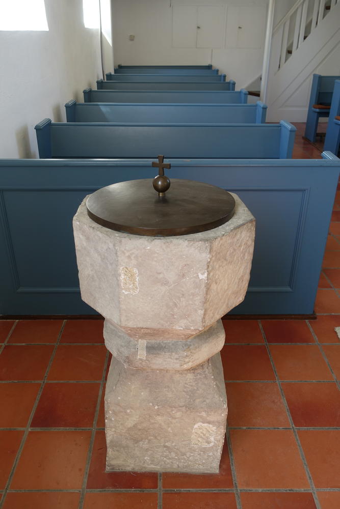 Der Taufstein aus der ersten Hälfte des 16. Jh. hat einen quadratischen Sockel, der in einen achteckigen Schaft mit Wulstring übergeht. Das achteckige Wasserbecken ist mit einem mit Kreuz und Kugel verziertem Bronzedeckel verschlossen.