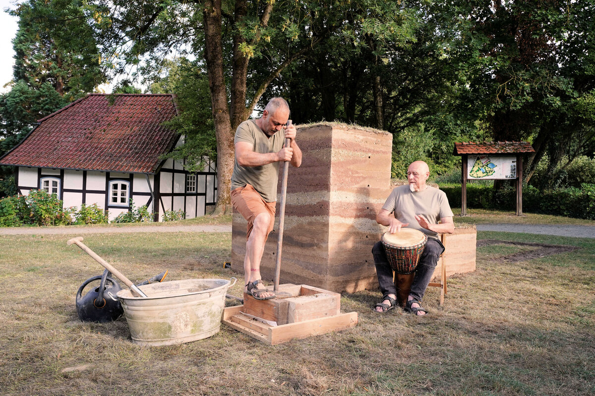 In Form einer brutalistischen Treppenstruktur, die an eine Zikkurat erinnert, führt die Installation die Besucher/-innen auf eine symbolische Reise hinab in die Tiefe der Erdschichten und wieder hinauf ans Licht. Die Skulptur wurde mit der traditionellen Technik des Stampflehms errichtet.„Schicht für Schicht wurde der Boden verdichtet und so ein komplettes Relief erzeugt, das den geologischen Schichtaufbau der Region sichtbar macht“, erzählt der Künstler. Für das Werk wurden ausschließlich lokale Erden genutzt.