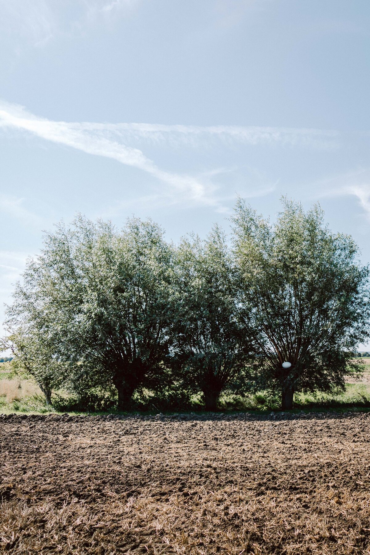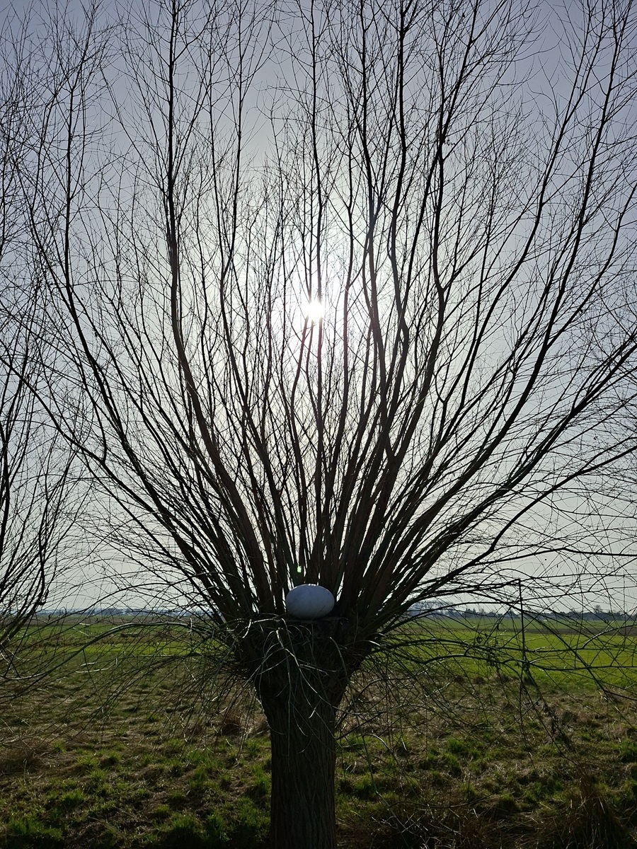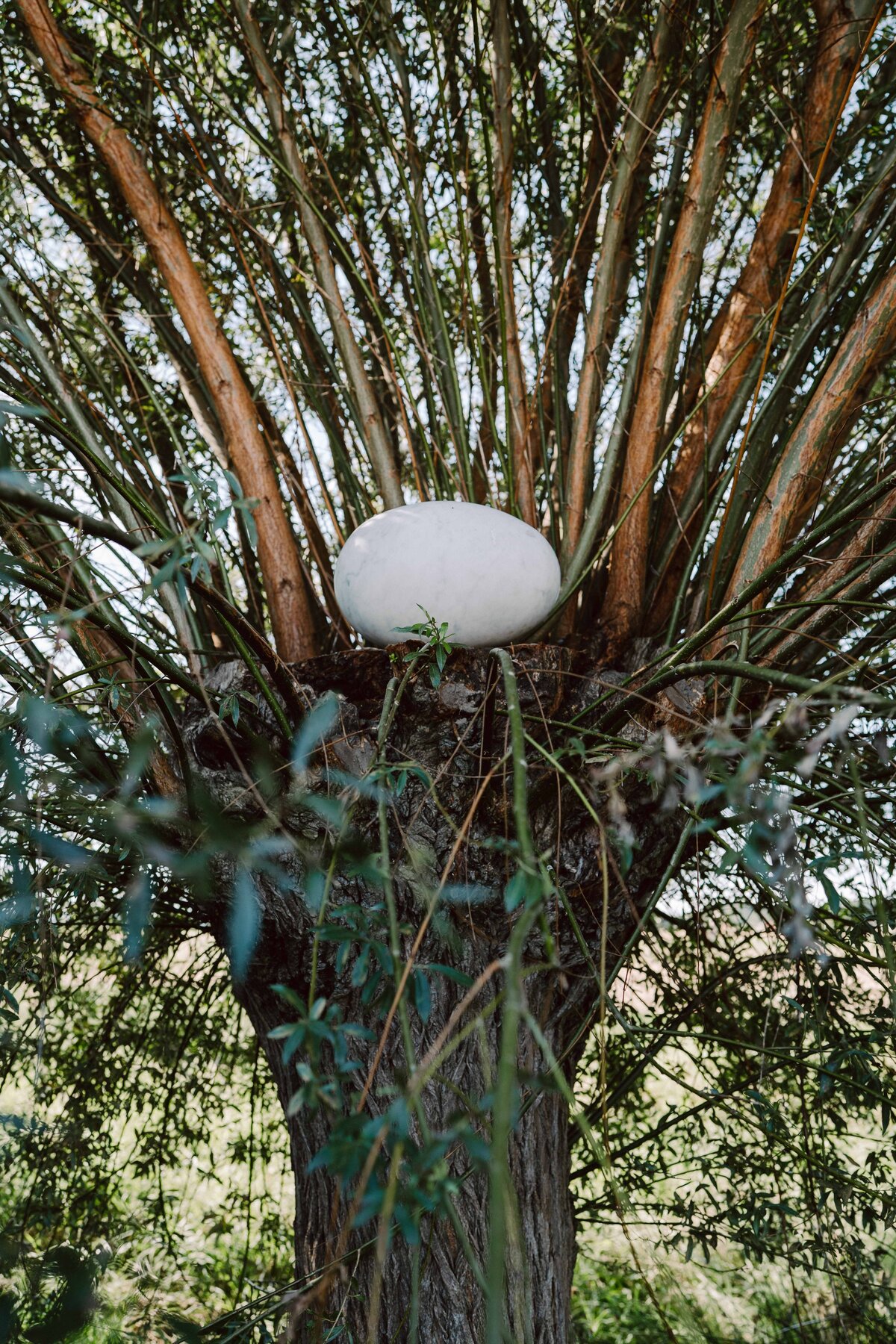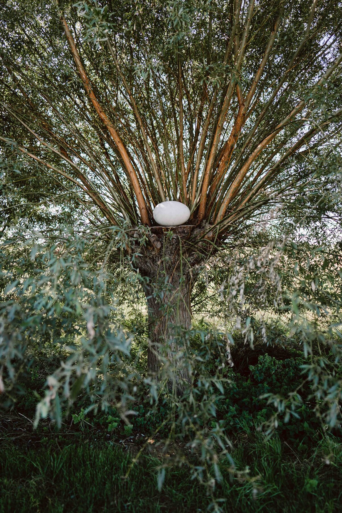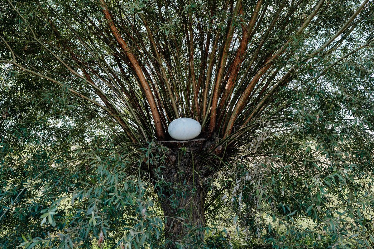 Als aktiver Künstler der Gegenwart gibt NILS-UDO keine Interpretation oder Bedeutungen seiner Arbeiten vor, auch wenn einige Elemente sofort eine Symbolik evozieren. Die Werke erschließen sie sich aber vielmehr in einem Dialog zwischen Betrachtenden und Werk. In Garmissen ruht ein weißes 'Marmorei' auf dem gekürzten Stamm einer teilweise geschnittenen Weide. Diese ist die mittlere von fünf dort wachsenden Weiden. Die im Hintergrund belassenen Weidenäste des 'Marmoreis' scheinen sich strahlenförmig auszubreiten. Im Titel nicht erwähnt ist die dunkle Erde, die wie eine Schale in einer dünnen Schicht zwischen Holz und Ei aufgetragen ist. Sie ist aber wesentlich für die leuchtende Erscheinung des Marmors und damit die gesamte Erscheinung des Werkes. Wie in der Landschaft ist der Erdboden hier unscheinbarer aber essentieller Träger des Seins.