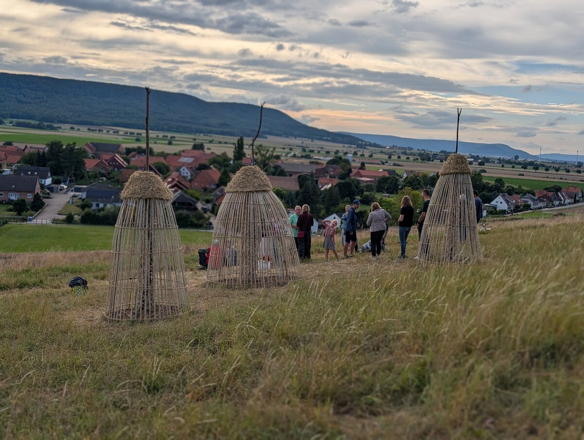 Nach einer kurzen Begrüßung durch Ortrud Michael, Dorfmoderatorin, gab Birgit Krauß vom Kulturbüro Hildesheim Einblicke in das Projekt. Anschließend erzählte Karin van der Molen, warum sie sich für dieses Werk entschieden hat: Die Arbeit besteht aus drei transparenten Heuhaufenformen, die wie stille Erinnerungen an vergangene Zeiten wirken. Einst prägten solche Heuhaufen die Felder der Region - Sinnbilder für das enge Miteinander von Mensch, Tier und Erde. Heute sind sie aus dem hiesigen Landschaftsbild verschwunden. In ihrer Installation tauchen sie neu auf: nicht mehr als praktische Objekte, sondern als fragile, durchscheinende Kunstwerke. Sie erscheinen flüchtig, fast unwirklich – wie eine Fata Morgana, die zugleich die Geschichte erzählt und den Blick für die Landschaft neu öffnet.