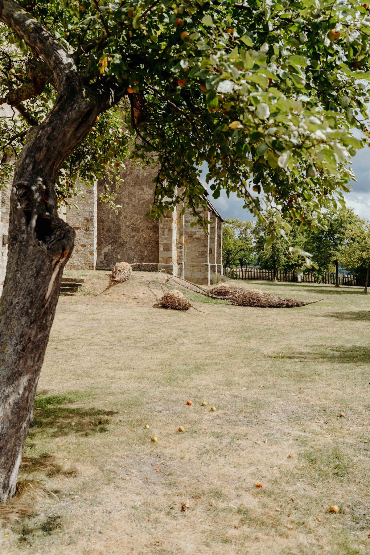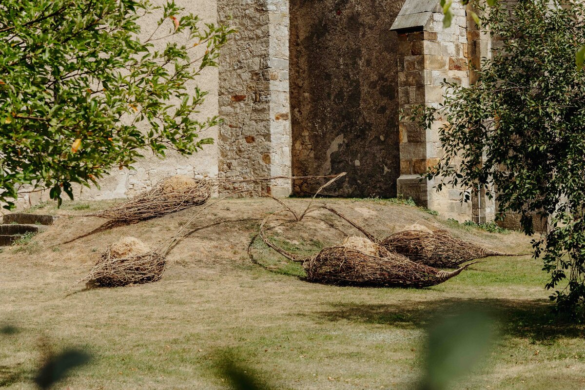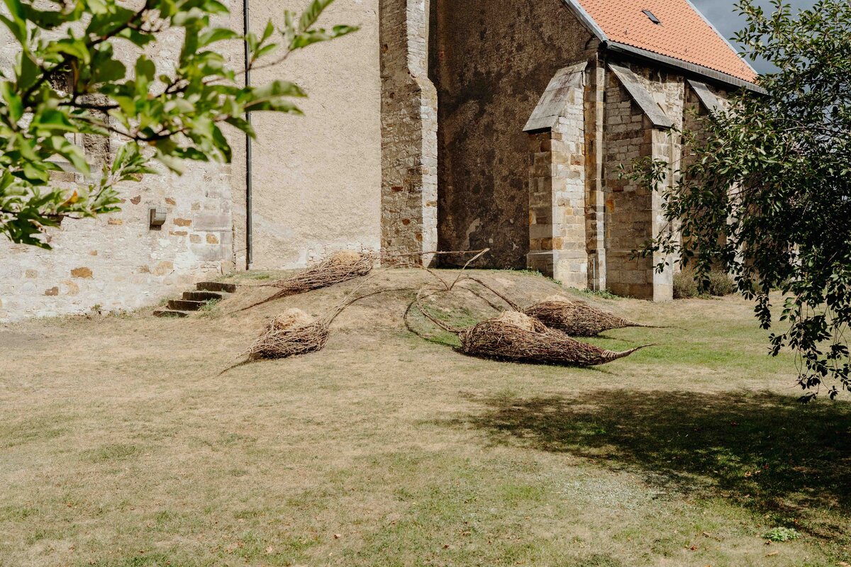 Die aus Naturmaterialien kreierte Installation von Anna und Michael Rofka an der Wittenburger Kirche mag auch an Schoten erinnern. Im Titel spielen sie aber auch mit den Assoziationen 'Bote' und 'Boote'. Auf jeden Fall sind es organische aus Zweigen geformte Objekte in denen sich Kugeln aus Zweigen und Gras befinden. Eingebettet sind sie in verschieden farbige Erden. Die einzelnen Elemente sind miteinander verbunden. Auch wenn sie an pflanzliche Gebilde erinnern bieten sie keine direkte begriffliche Entsprechung, auch wenn sie von Samenformen inspiriert sind. Vielmehr sind sie ein Fantasieprodukt, dass natürliche Materialien in einen neuen Sinnzusammenhang bringt.