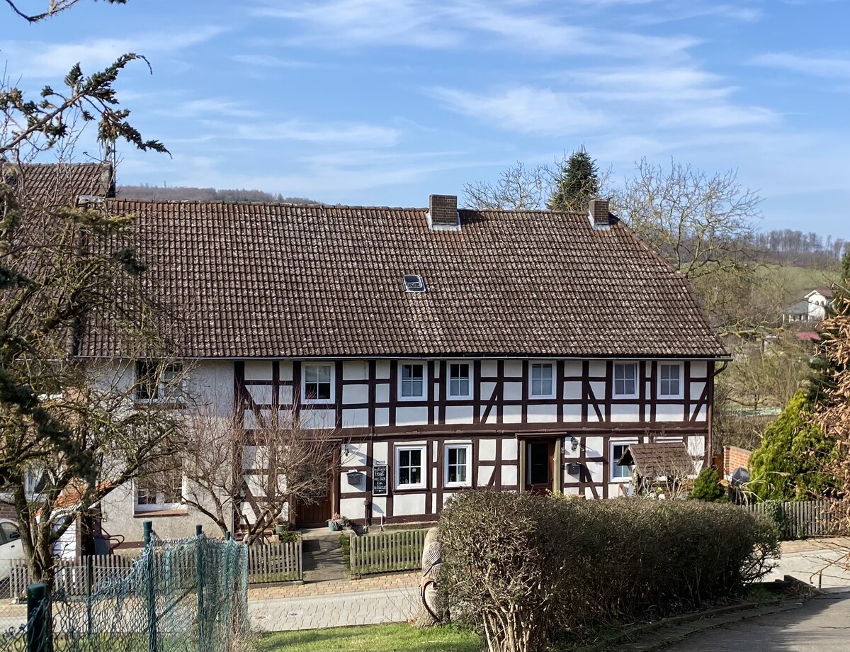 Der trauf- und giebelständige zweigeschossige Fachwerkbau über einem Sandsteinquadersockel steht auf einem Eckgrundstück und ist unmittelbar an die Straße gebaut. Die Gefache des Fachwerks sind mit Lehm verputzt. Das Gebäude hat ein Krüppelwalmdach. An der Südseite ist das Obergeschoss, die Westseite vollständig mit Ziegeln verkleidet. Der zur Straße "Im Wiesengrunde" liegende Eingang hat ein leicht vorkragendes Obergeschoss.