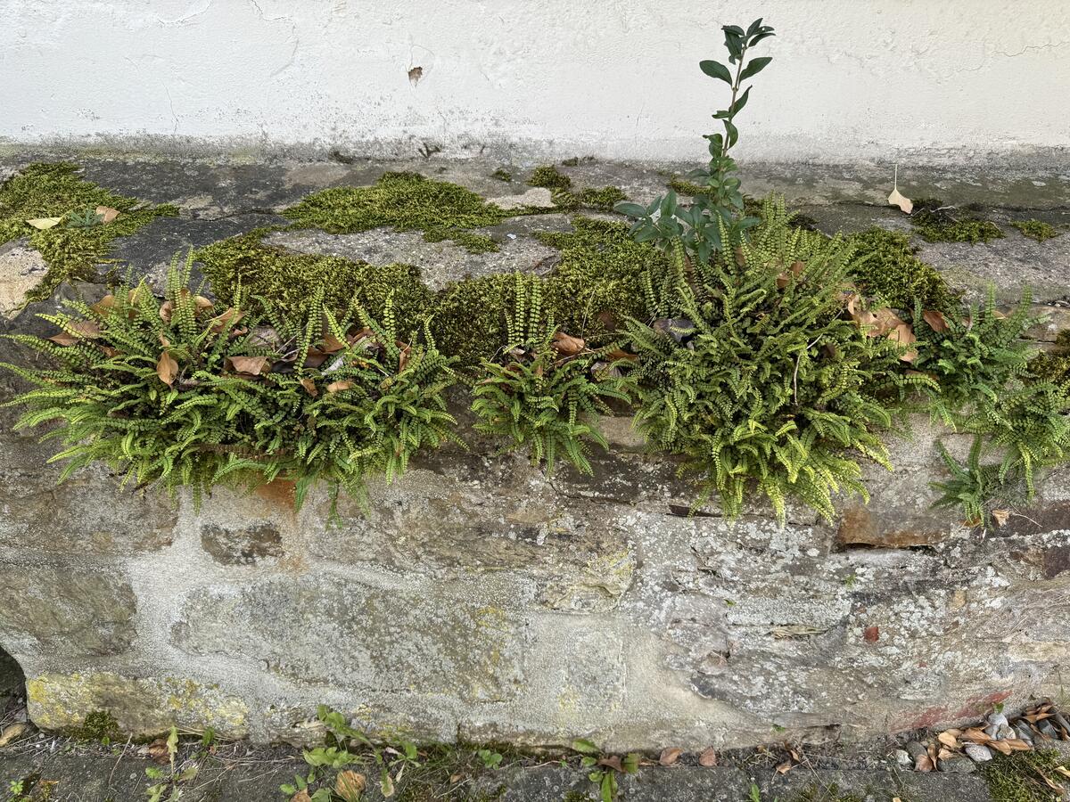 In der Friedhofsmauer der St. Nikolaus-Kirche haben sich zwei Farne ausgebreitet: Die „Mauerraute“ und der sehr seltene „Braunstielige Streifenfarn“. Farne haben nur sehr feine Würzelchen, die die Wände trocken halten und die Steine nicht sprengen.