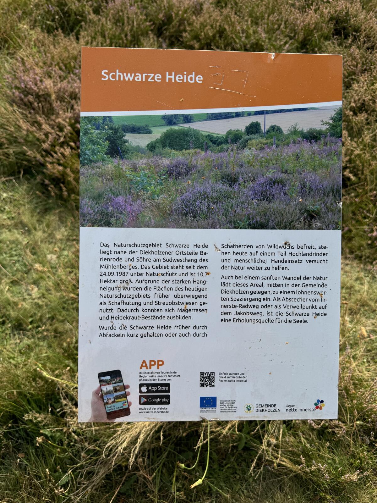 Von der Katholischen Kirche in der Dorfmitte erreicht man die Schwarze Heide über die Kirchstraße, geht zur Heinrich-Heine-Straße und biegt dann links in die Eichstraße ab. Nun geht es bergauf, immer geradeaus und am Ende der Straße beginnt links das Naturschutzgebiet “Schwarze Heide” Ein Wanderweg führt vorbei an einer Weide mit Galloways und Auerochsen, dem Friedhof, alten Eichen, die sich herrlich zum Klettern eignen, einem Denkmal und Bänken, die zum Ausruhen einladen. Und schließlich sieht man auf der rechten Seite eine Heidelandschaft, die im August dunkelrot blüht und ungefähr 10 Hektar groß ist. Und man hat einen herrlichen Blick ins Tal. Von hier kann man weiterwandern bis Diekholzen, zum Heidekrug oder geradeaus bis Söhre.