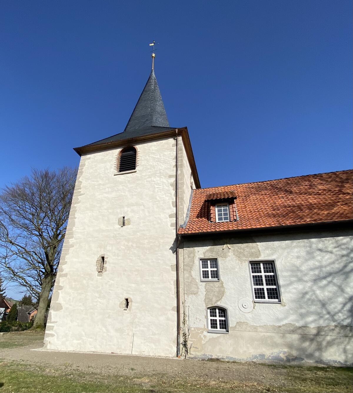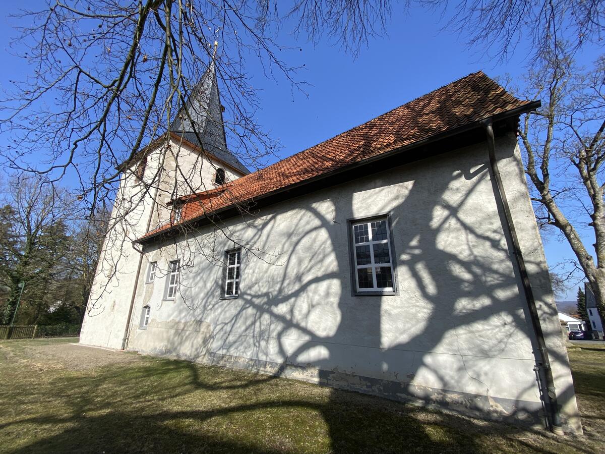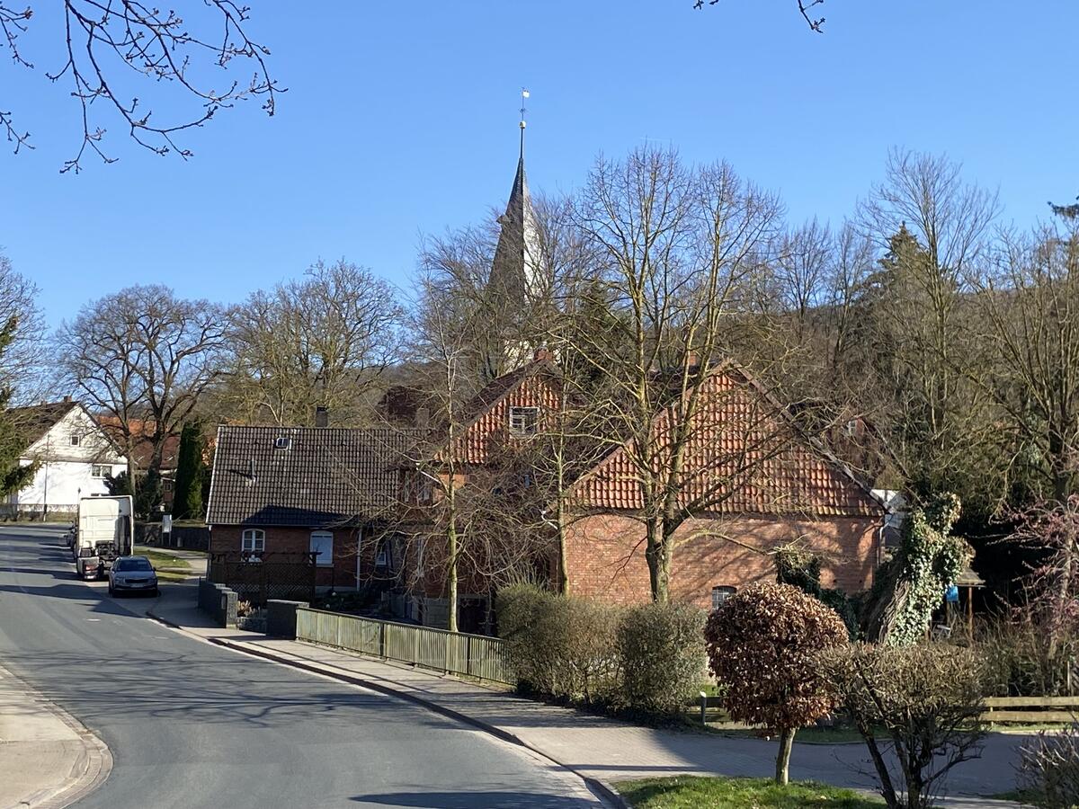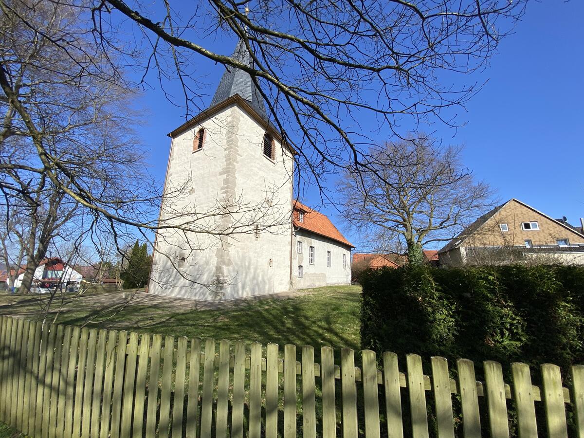Die St.-Bartholomäus-Kirche liegt etwas erhöht auf dem mit Bäumen bestandenen ehemaligen Friedhof in der Südhälfte von Eberholzen.