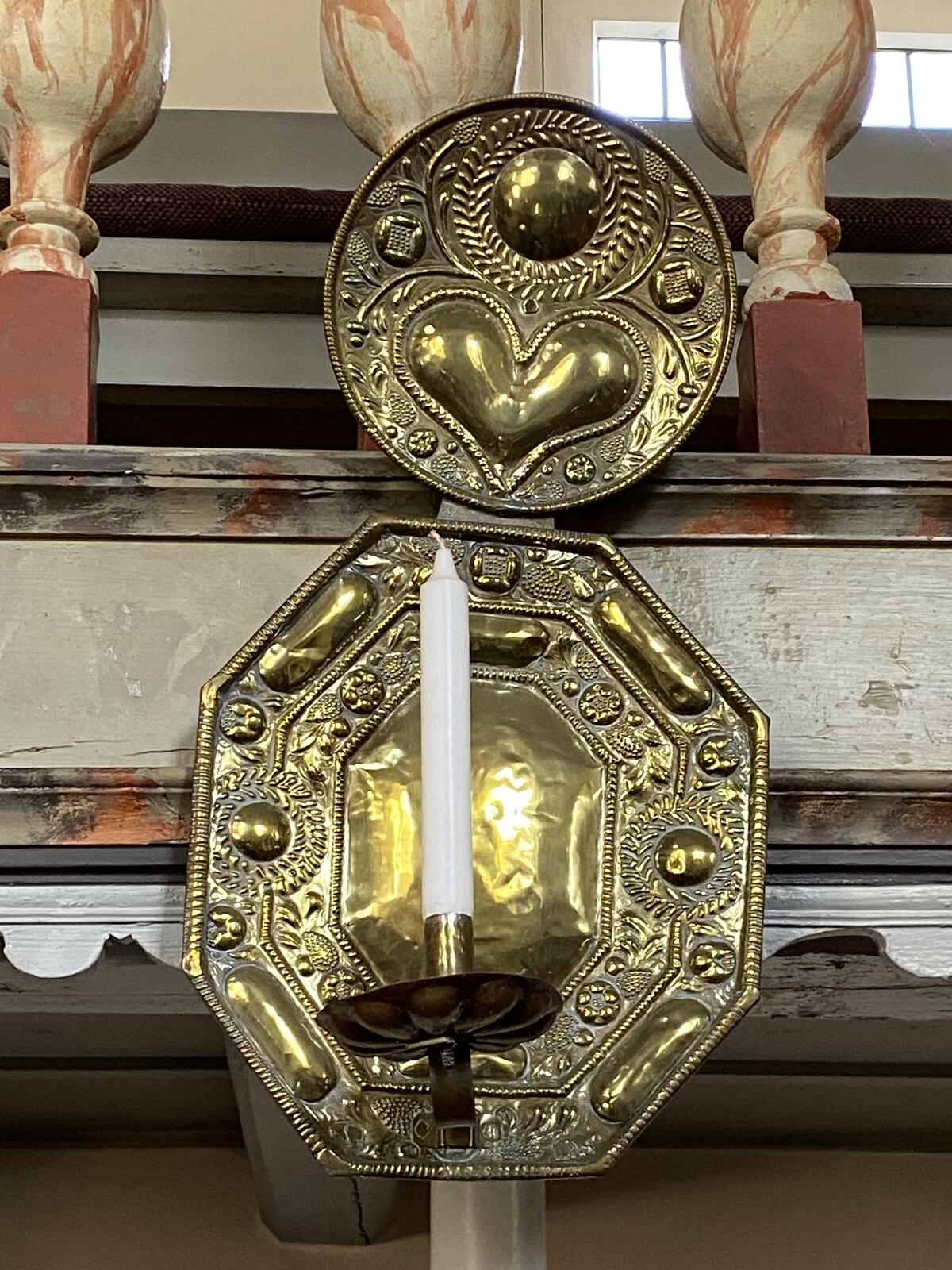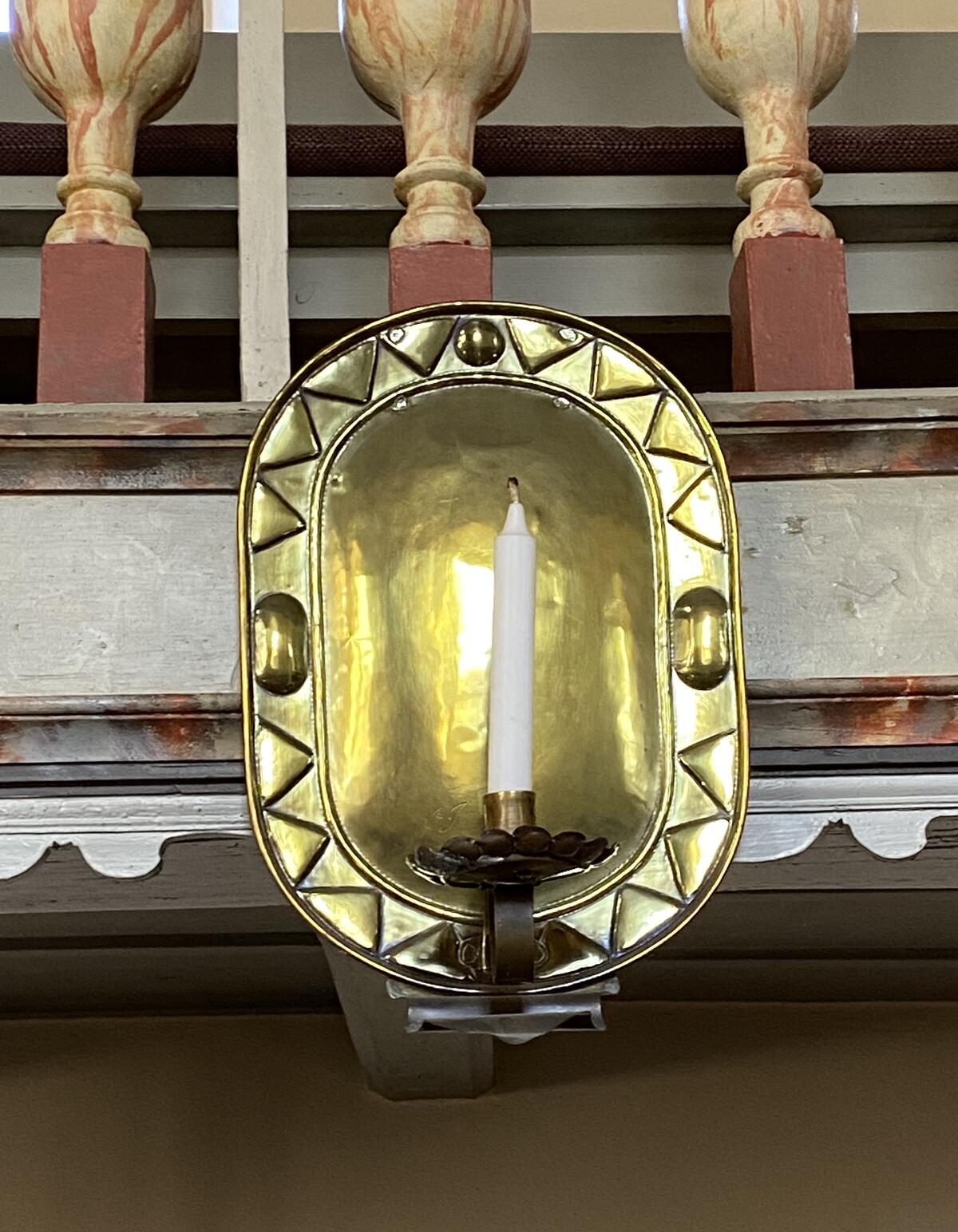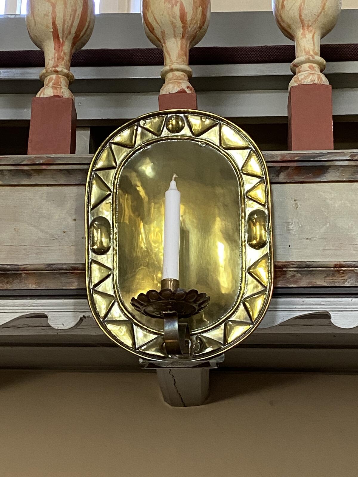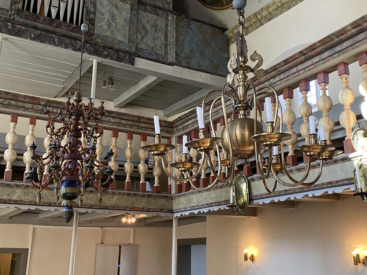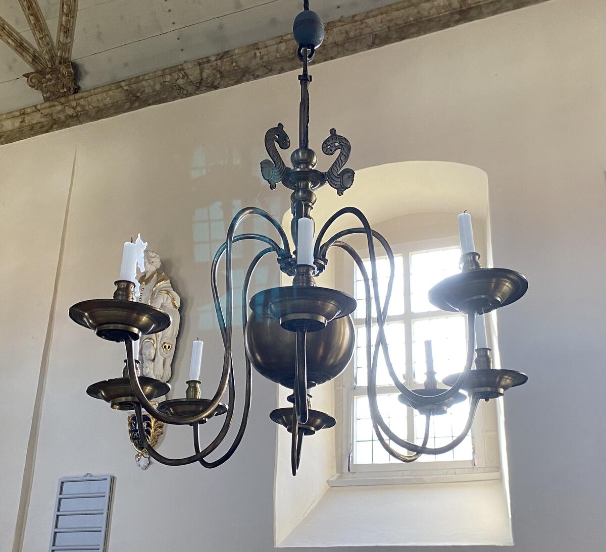 Im Mittelschiff hängen zwei Kronleuchter. Der achtarmige Messingleuchter wurde 1649 angefertigt.