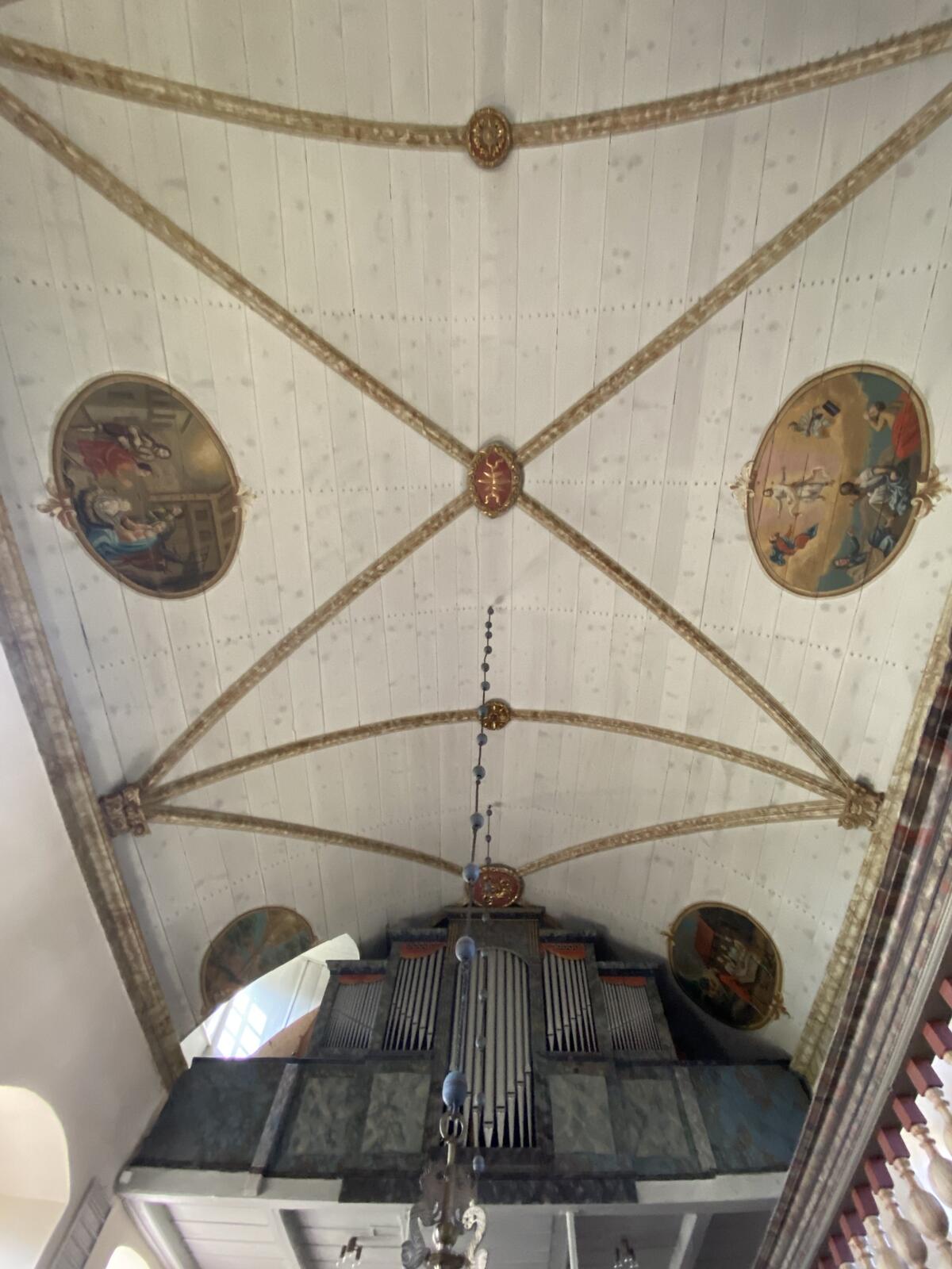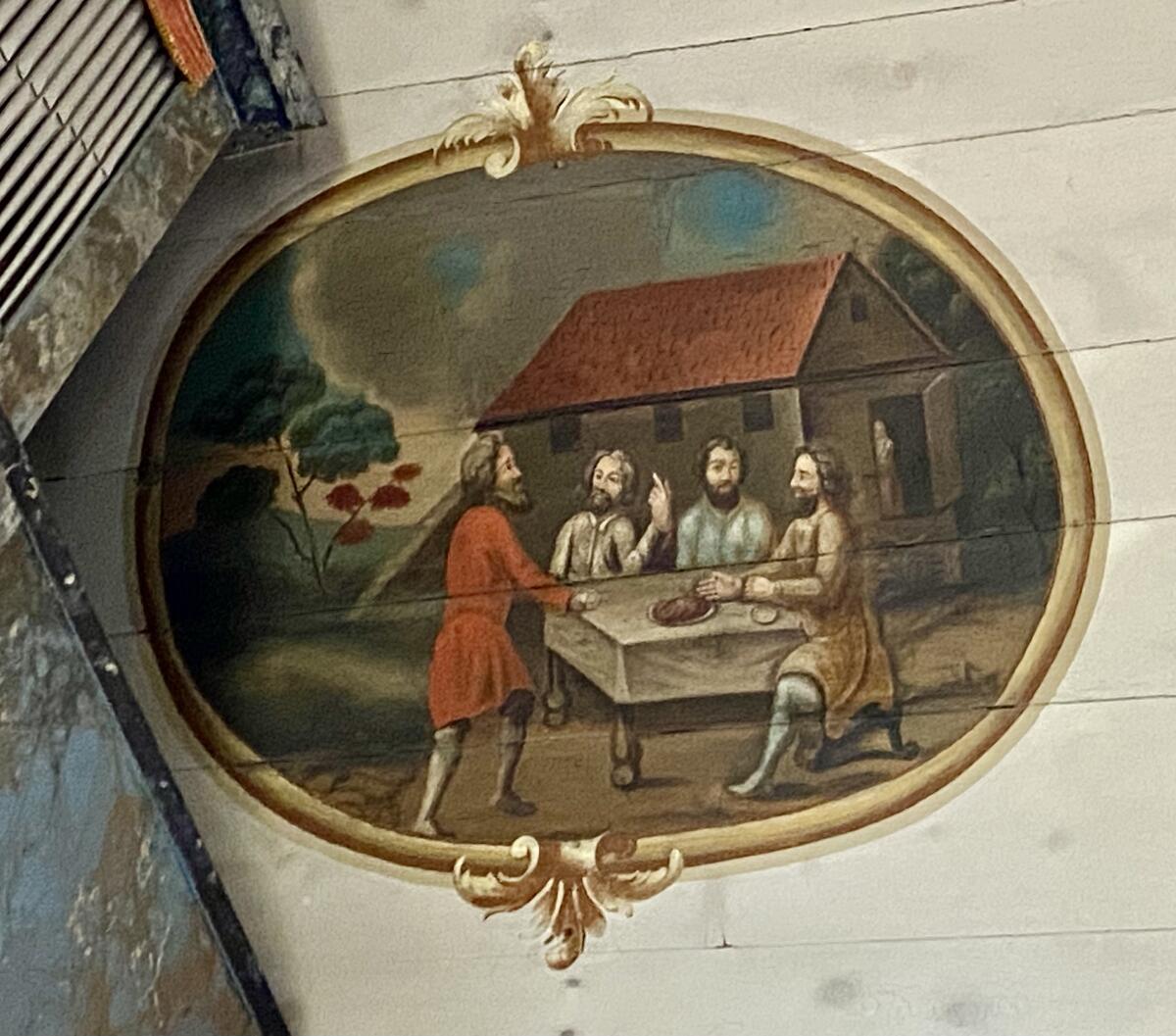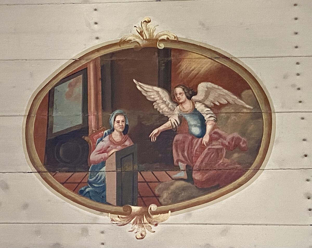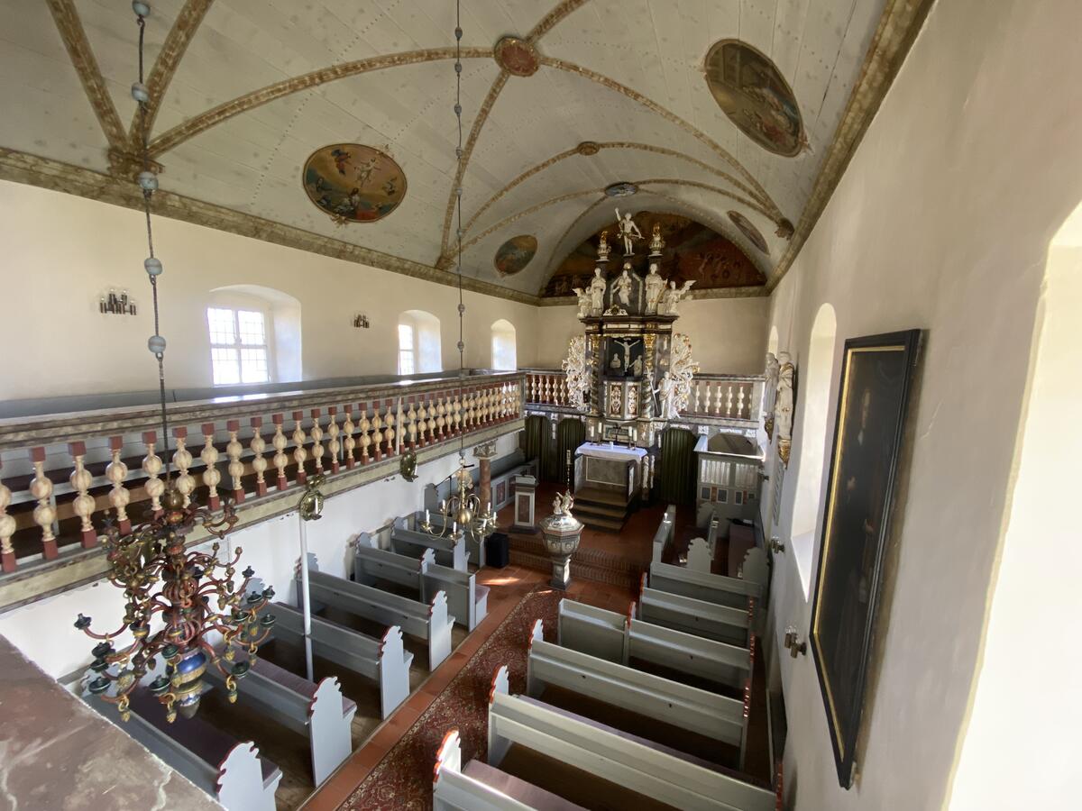 Mitte des 18. Jahrhunderts wurde die Kirche mit Deckenmalereien versehen. Im östlichen Bogenfeld ist, zum großen Teil von der Kanzelwand verdeckt, das Jüngste Gericht dargestellt, in sechs querovalen Medaillons sind Jesaja, die Verklärung des Herrn, die Engel bei Abraham, die Verkündigung, die Geburt Christi und der Traum Jakobs zu sehen. Letzteres wird zum Teil von einer Fensteröffnung durchschnitten, der mit dem Einbau der Orgel entstand.