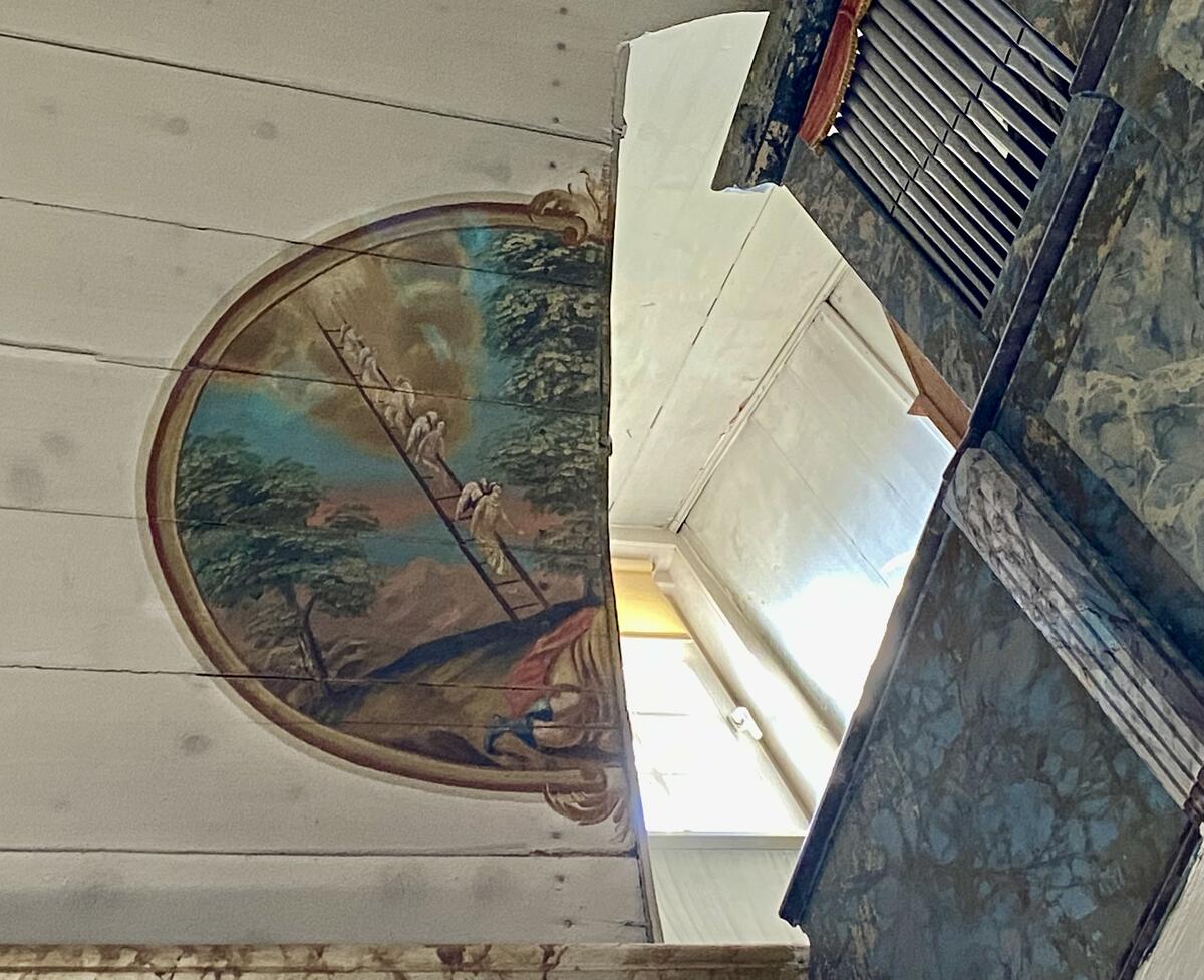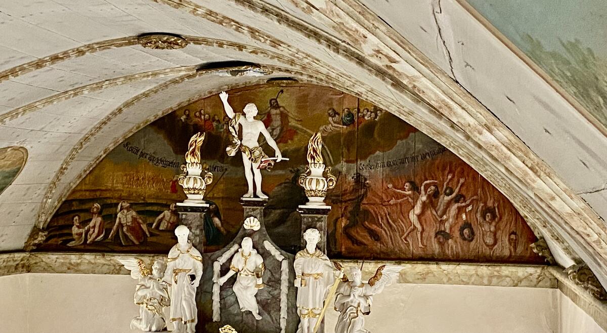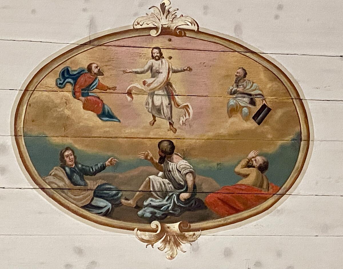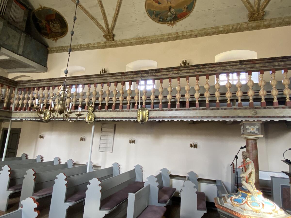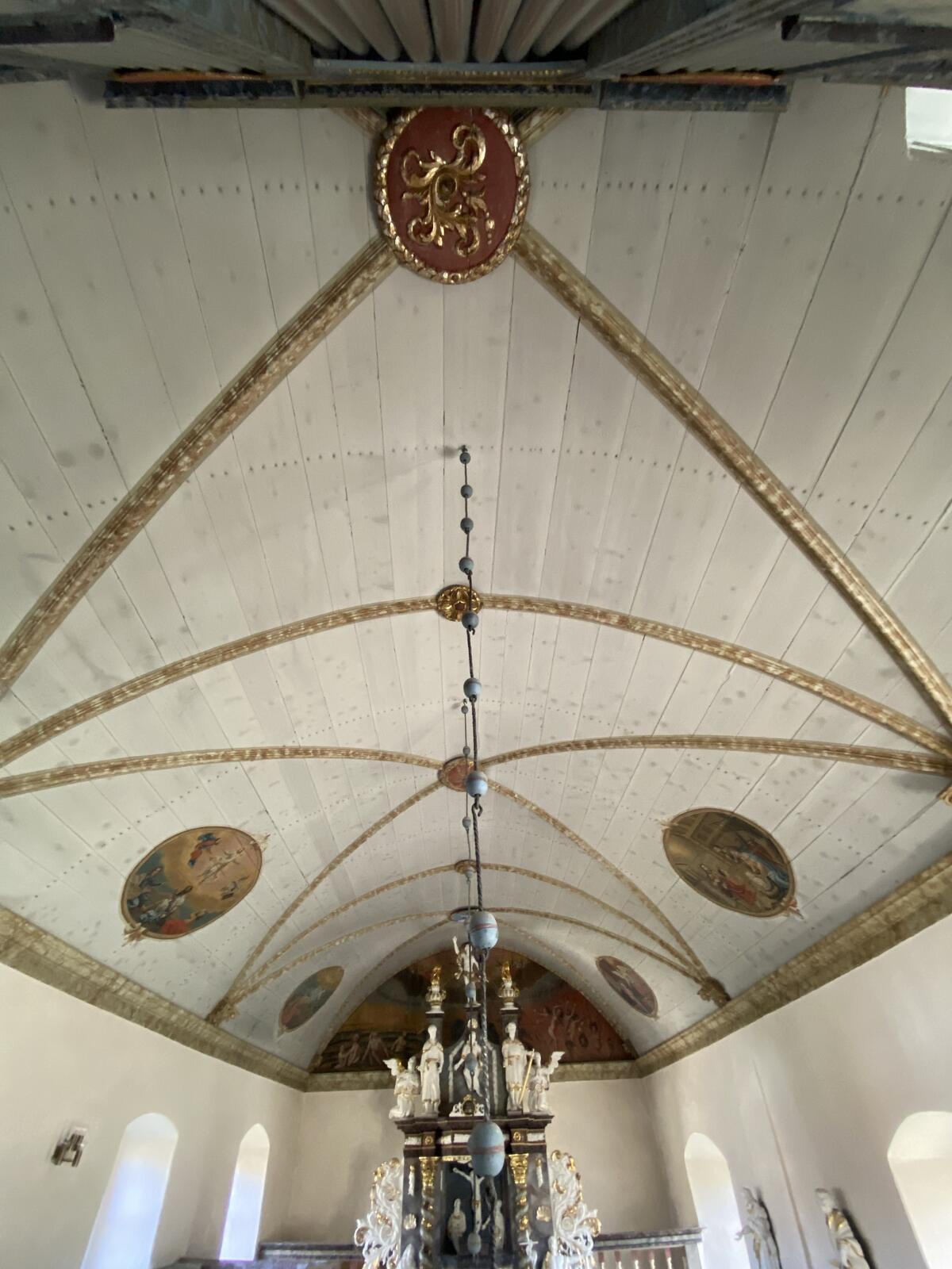 Mitte des 18. Jahrhunderts wurde die Kirche mit Deckenmalereien versehen. Im östlichen Bogenfeld ist, zum großen Teil von der Kanzelwand verdeckt, das Jüngste Gericht dargestellt, in sechs querovalen Medaillons sind Jesaja, die Verklärung des Herrn, die Engel bei Abraham, die Verkündigung, die Geburt Christi und der Traum Jakobs zu sehen. Letzteres wird zum Teil von einer Fensteröffnung durchschnitten, der mit dem Einbau der Orgel entstand.