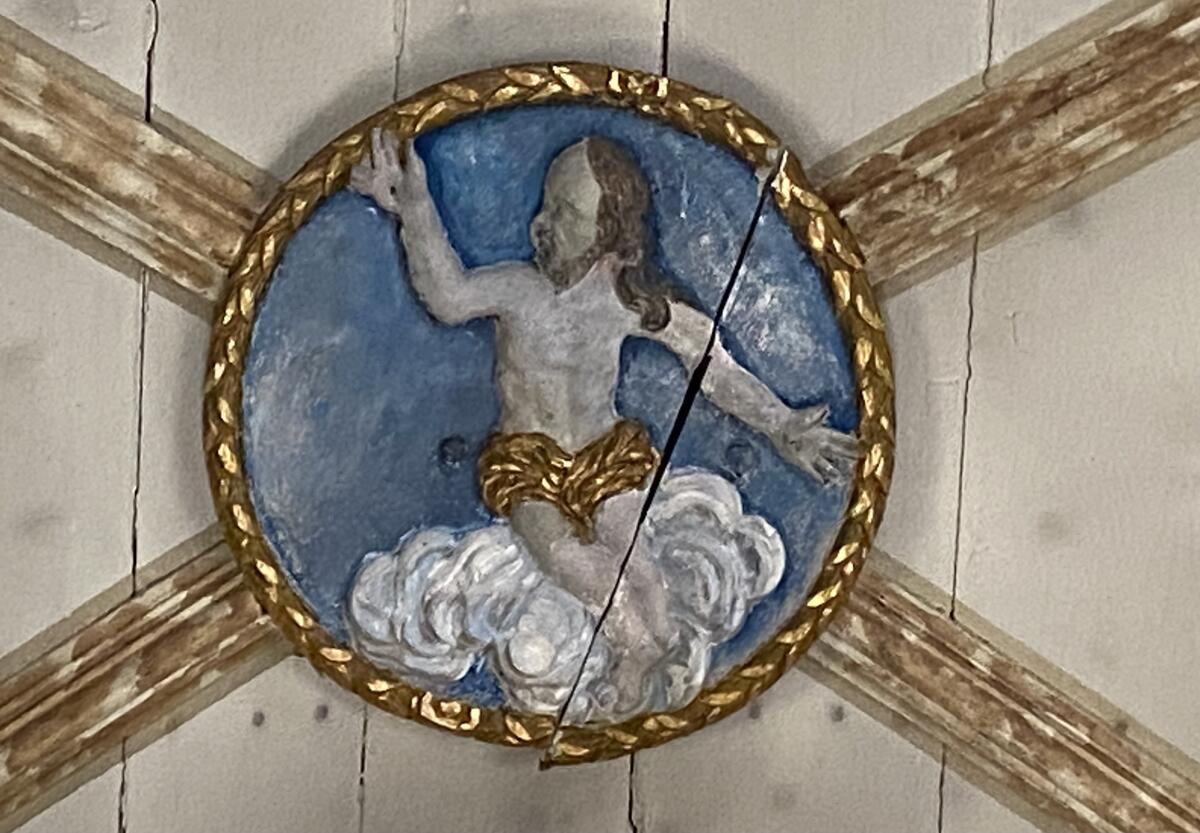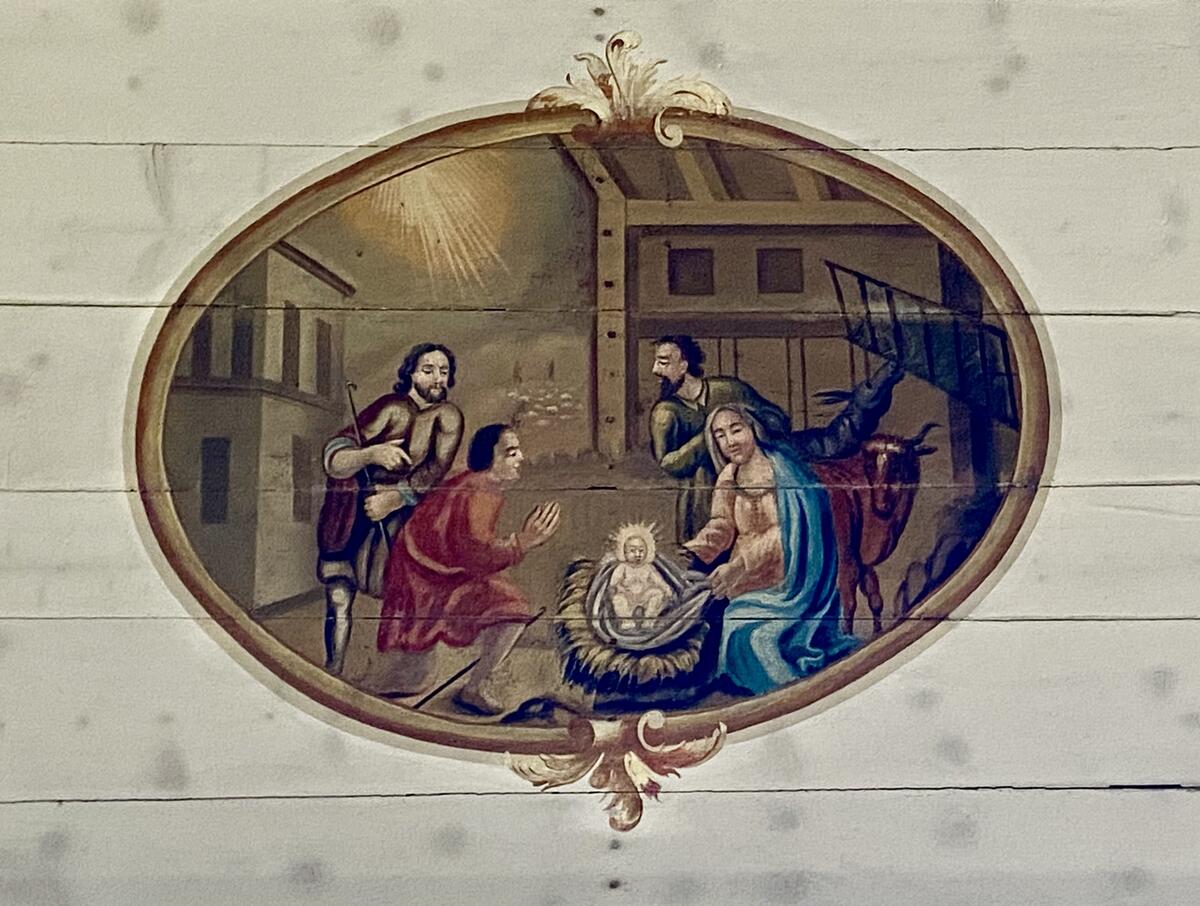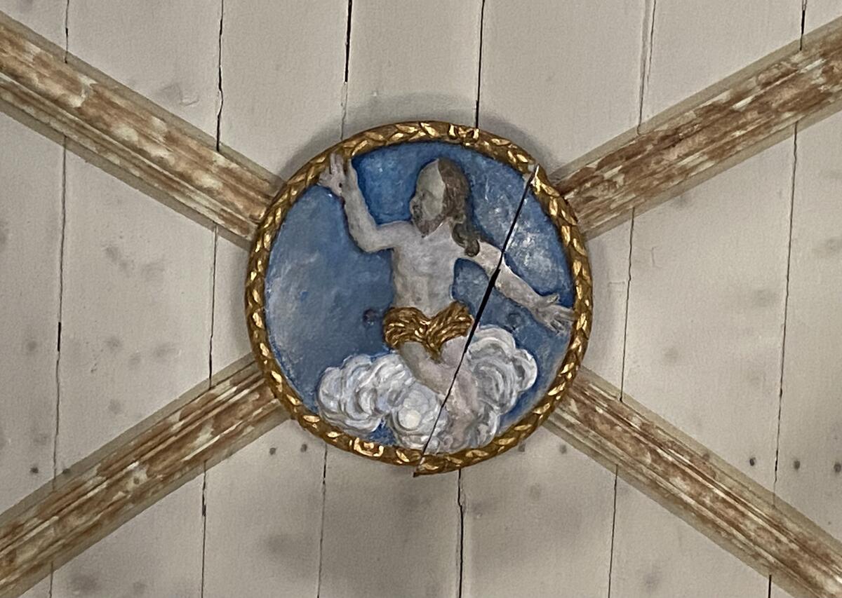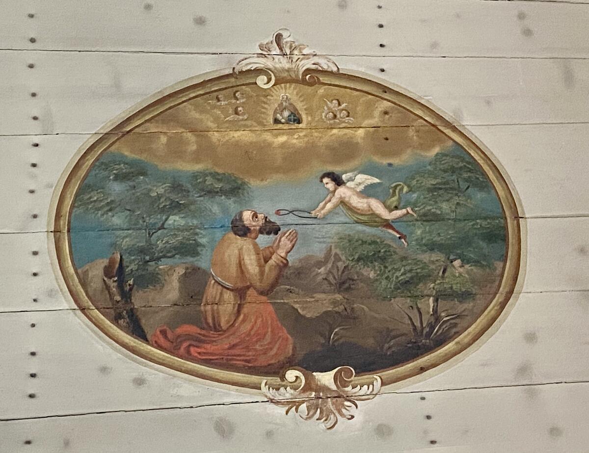 Mitte des 18. Jahrhunderts wurde die Kirche mit Deckenmalereien versehen. Im östlichen Bogenfeld ist, zum großen Teil von der Kanzelwand verdeckt, das Jüngste Gericht dargestellt, in sechs querovalen Medaillons sind Jesaja, die Verklärung des Herrn, die Engel bei Abraham, die Verkündigung, die Geburt Christi und der Traum Jakobs zu sehen. Letzteres wird zum Teil von einer Fensteröffnung durchschnitten, der mit dem Einbau der Orgel entstand.