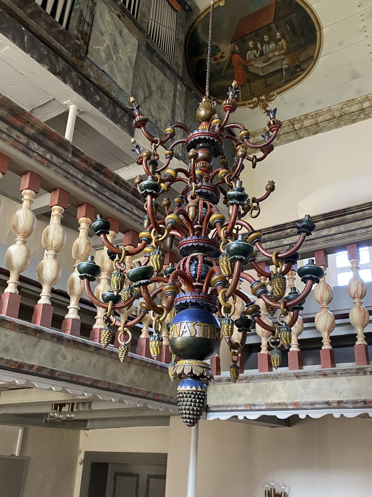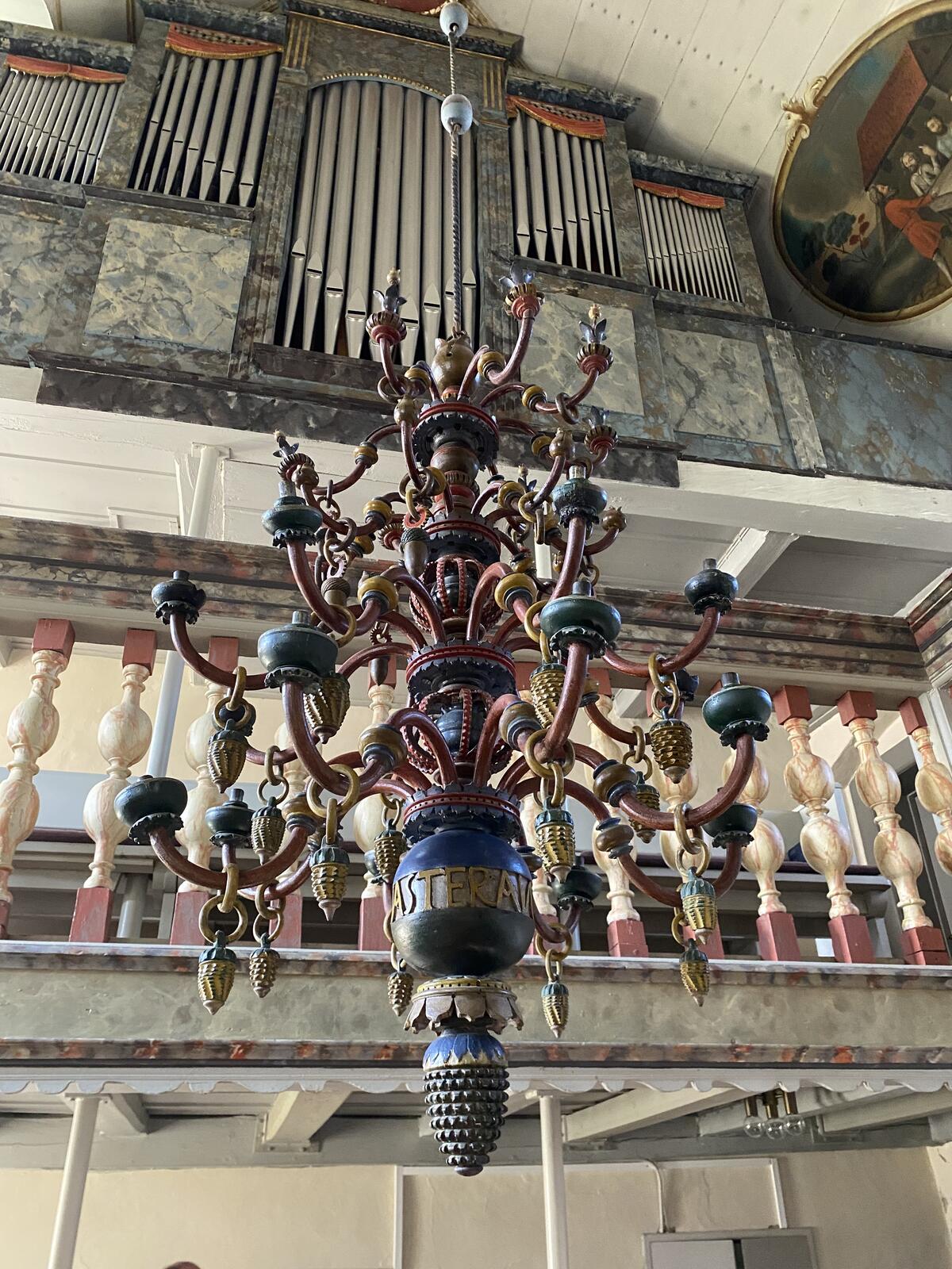Ungewöhnlicher ist der zweite und größere Lindenholzleuchter vor der Orgelempore aus dem Jahre 1695. Er ist über vier Geschosse mit jeweils acht Armen aufgebaut, farbig gestaltet und mit Blüten, Zapfen und Holzringen reich verziert.