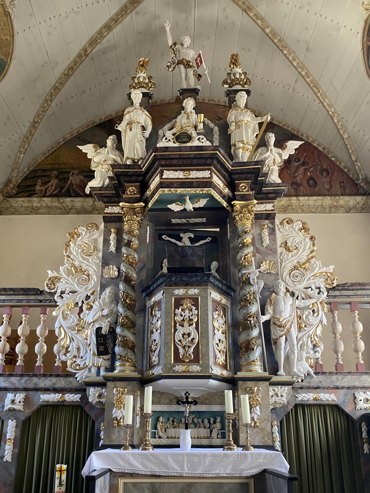 Der mit Akanthus verzierte hölzerne Kanzelaltar wurde 1731 gebaut. Der dreiseitig vorspringende Kanzelkorb, der über die Altarempore erreichbar ist, wird eingerahmt von gedrehten und blumenumwundenen Säulen. Links sind die Figuren von Moses und rechts von Johannes dem Täufer zu erkennen. Auf der Kanzelbekrönung sind Petrus und Paulus sowie zwei Engel zu sehen, zwischen ihnen etwas kleiner und sitzend eine Figur mit Kelch, darüber der auferstandene Christus mit Siegesfahne.