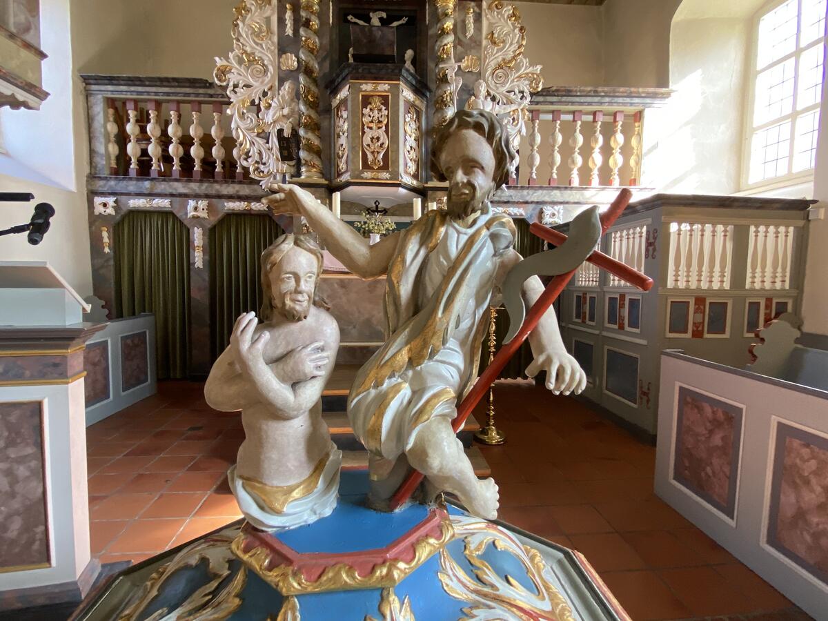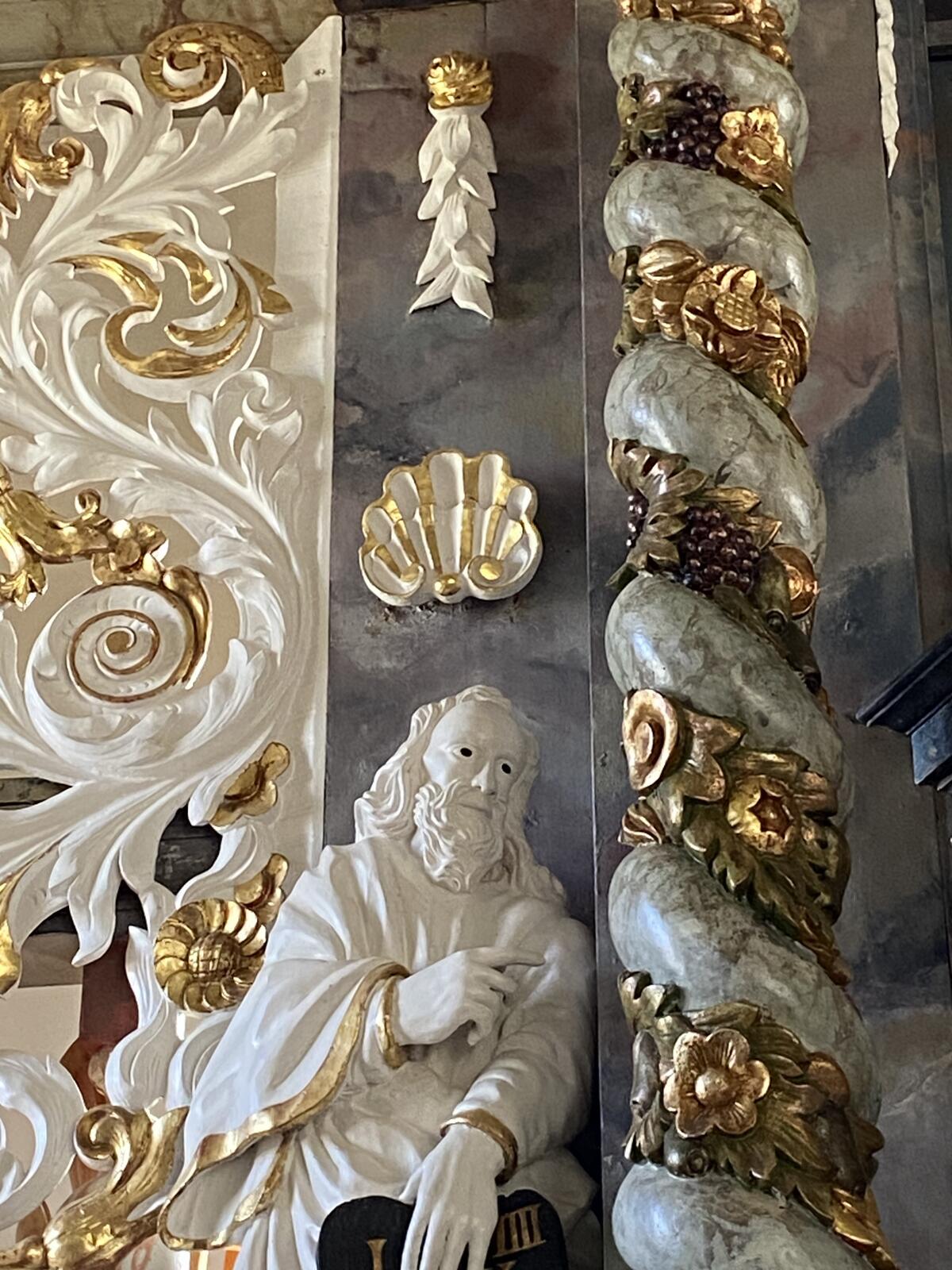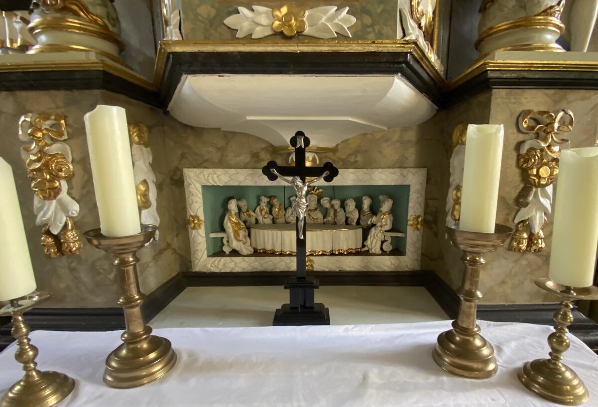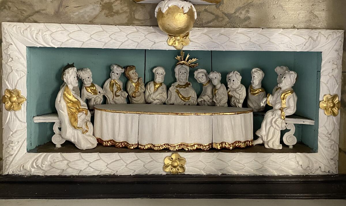 Unter der Kanzel erkennt man ein Relief mit der plastischen Darstellung des Abendmahls.