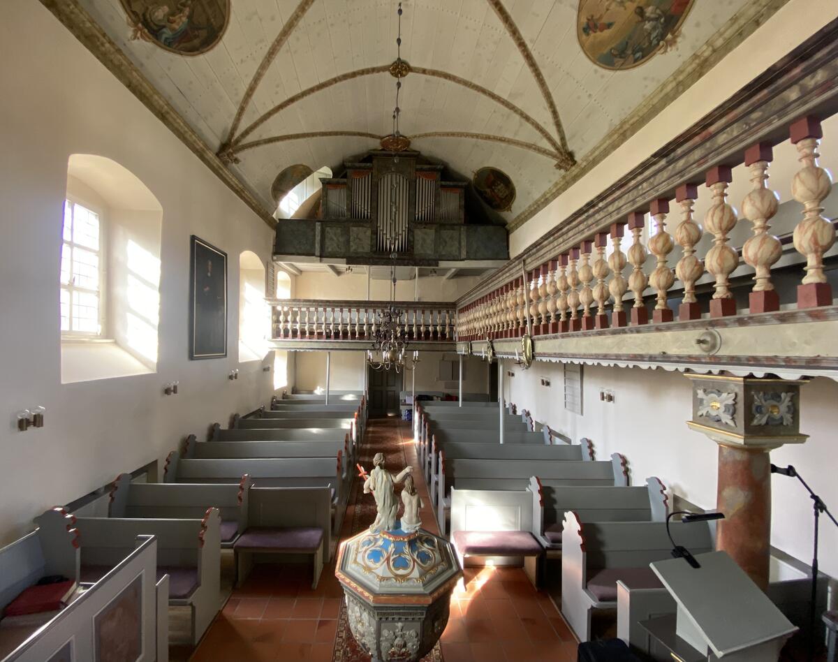 Der Innenraum, dessen qualitätvolle barocke Ausgestaltung bis heute erhalten ist, wird von einem hölzernen Tonnengewölbe überspannt, wobei Gewölberippen und Gurtbögen nachträglich untergelegt wurden. Die Altarempore im Osten wurde 1717, die im Westen und Norden 1722/23 eingebaut. Sie sind aus Tannen- und Eichenholz gefertigt. An der Nordempore sind drei mit Ornamenten verzierten Blaker aus Messingblech angebracht. Die dort eingearbeiteten Jahreszahlen und Buchstabenkürzel deuten auf Stiftungen aus dem Jahr 1725 hin.