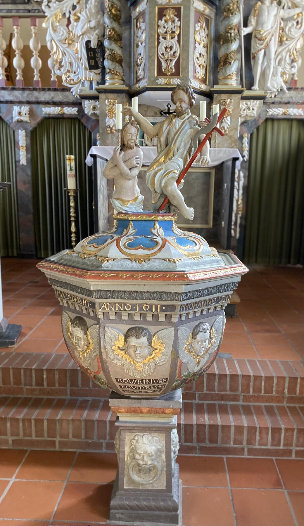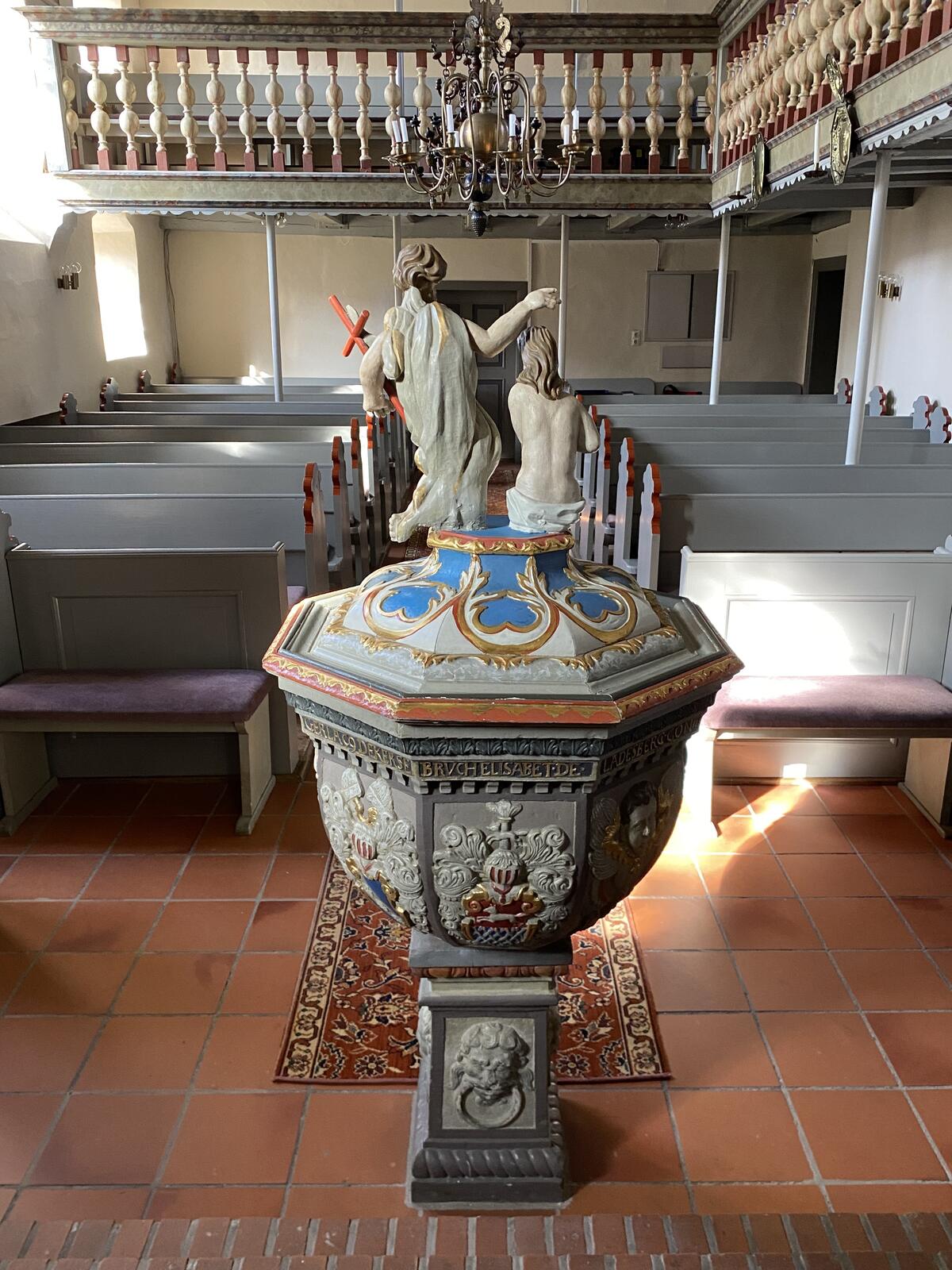 Das achteckige und farbig gestaltete Taufbecken aus Sandstein im Mittelgang vor dem Ostchor wurde der Gemeinde 1611 gestiftet. Die Wandungsseiten des gebauchten achteckigen Beckens sind verziert mit Engelsköpfen und Stifterwappen. Aus dem Schriftzug im Fries sind die Namen der Stifter Elisabet de La(n)desberg und Gerlac(us) de Kersebruch sowie des von 1607 bis 1632 verantwortlichen Pastors Johannes Leinemanus zu entnehmen. Die Meistersignatur am oberen Rand des Schaftgesimses mit den Initialen M und B lassen auf einen Steinmetzmeister aus dem Leinebergland schließen. Aufgrund dieser Buchstaben und übereinstimmender Schriftcharakteristika lässt sich ein Werkstattzusammenhang zu den Taufsteinen der Nachbardörfer in der Umgebung Adensen, Möllensen und Sibbesse sowie der Taufe von Klein Himstedt (Gem. Söhlde) herstellen.
