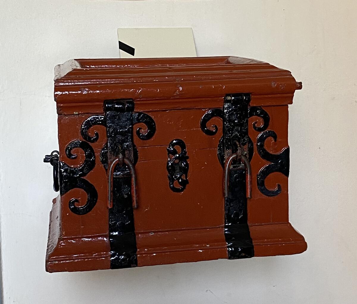 Der 1717 aus Lindenholz gefertigte Deckel ist mit geschnitzten Figuren des Christus und Johannes d. Täufer verziert.