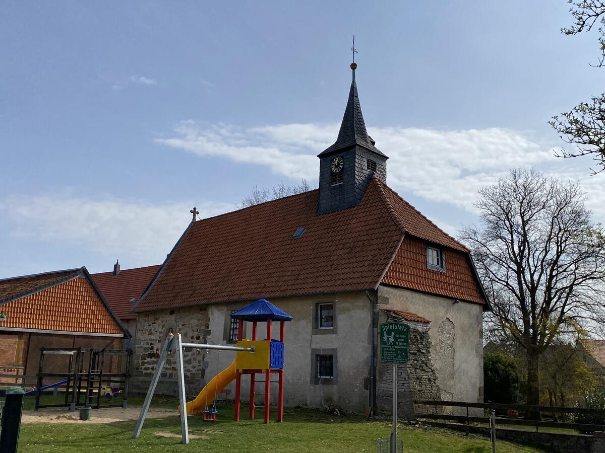 Der Spielplatz von Grafelde mit Sandgrube und Kletter- und Schaukelgeräten liegt auf der Nordseite der Marienkapelle.