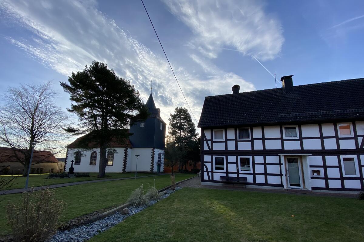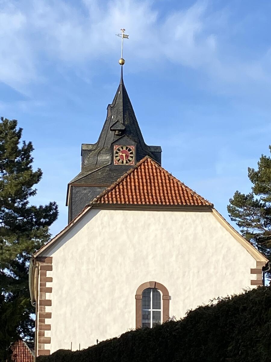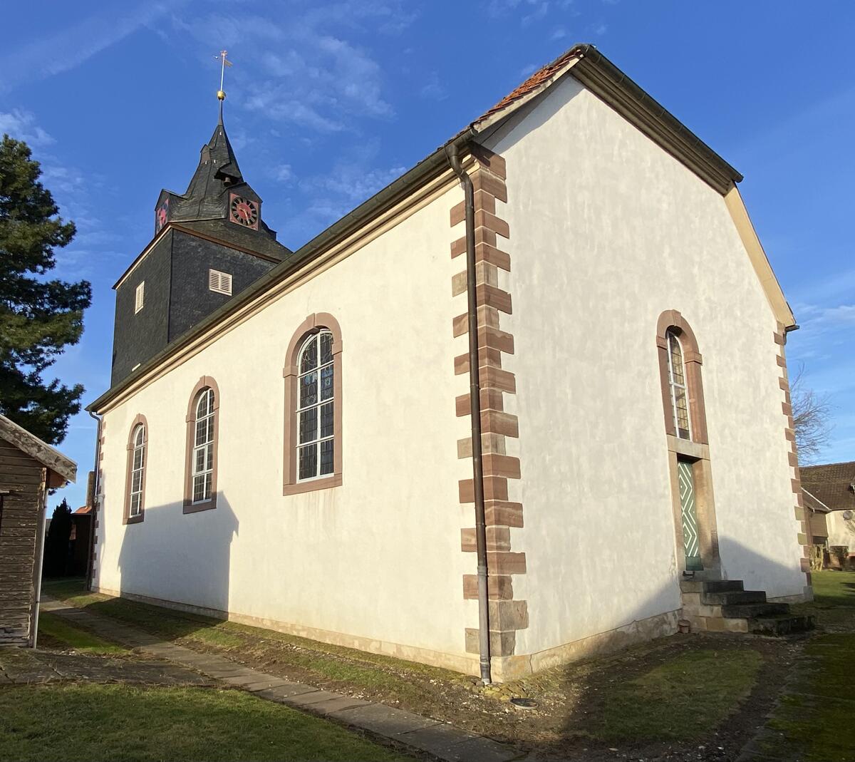 Der quadratische Westturm, der schmaler ist als das Kirchenschiff, wurde 1748 angebaut. Turm und Kirchenschiff sind mit Kalkmörtel verputzt. Der Turmhelm hat vier Uhrgauben und rechteckige Schallfenster und ist in der oberen Hälfte mit grauen Schieferplatten behängt. Er wurde zwischen 1796 und 1800 fertiggestellt und ist mit Kugel, Wetterfahne und Jahreszahl bekrönt. Im Turm hängen eine Schlagglocke aus dem Jahre 1716 sowie eine Läuteglocke aus dem Jahr 1872, die von J. H. Bartels in Hildesheim gegossen wurden. Über dem Eingangsportal zur Kirche, über dem sich ein weiteres Rundbogenfenster befindet, steht die Zahl 1748, das Jahr der Fertigstellung des Turmes. Außerdem ist hier das Jahr einer vollständigen Kirchenerneuerung 1912 zu erkennen. Die letzte Renovierung wurde 2005 durchgeführt.