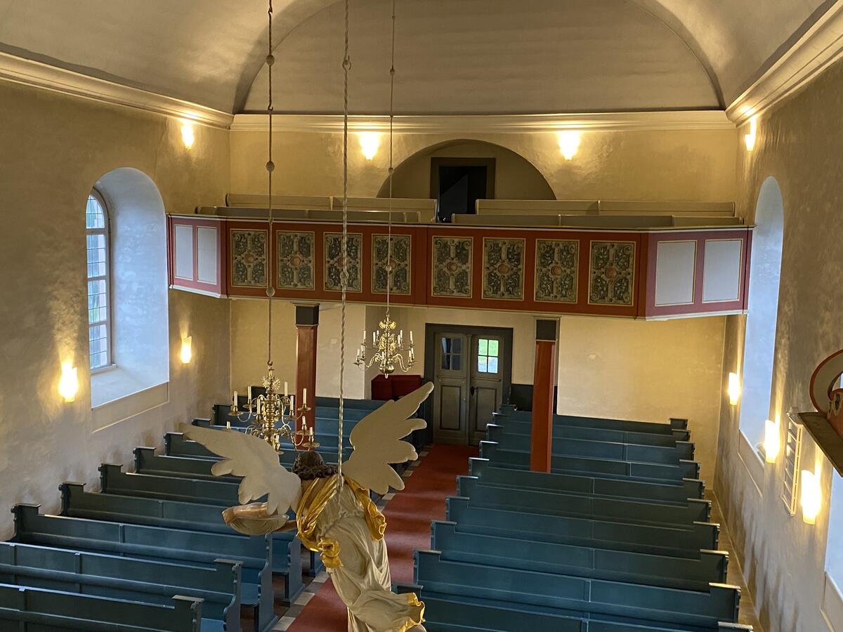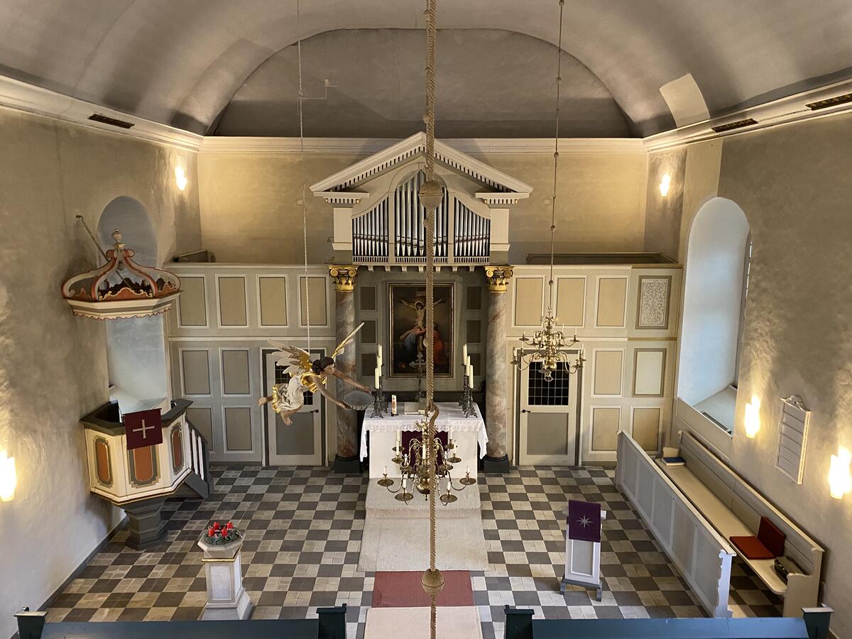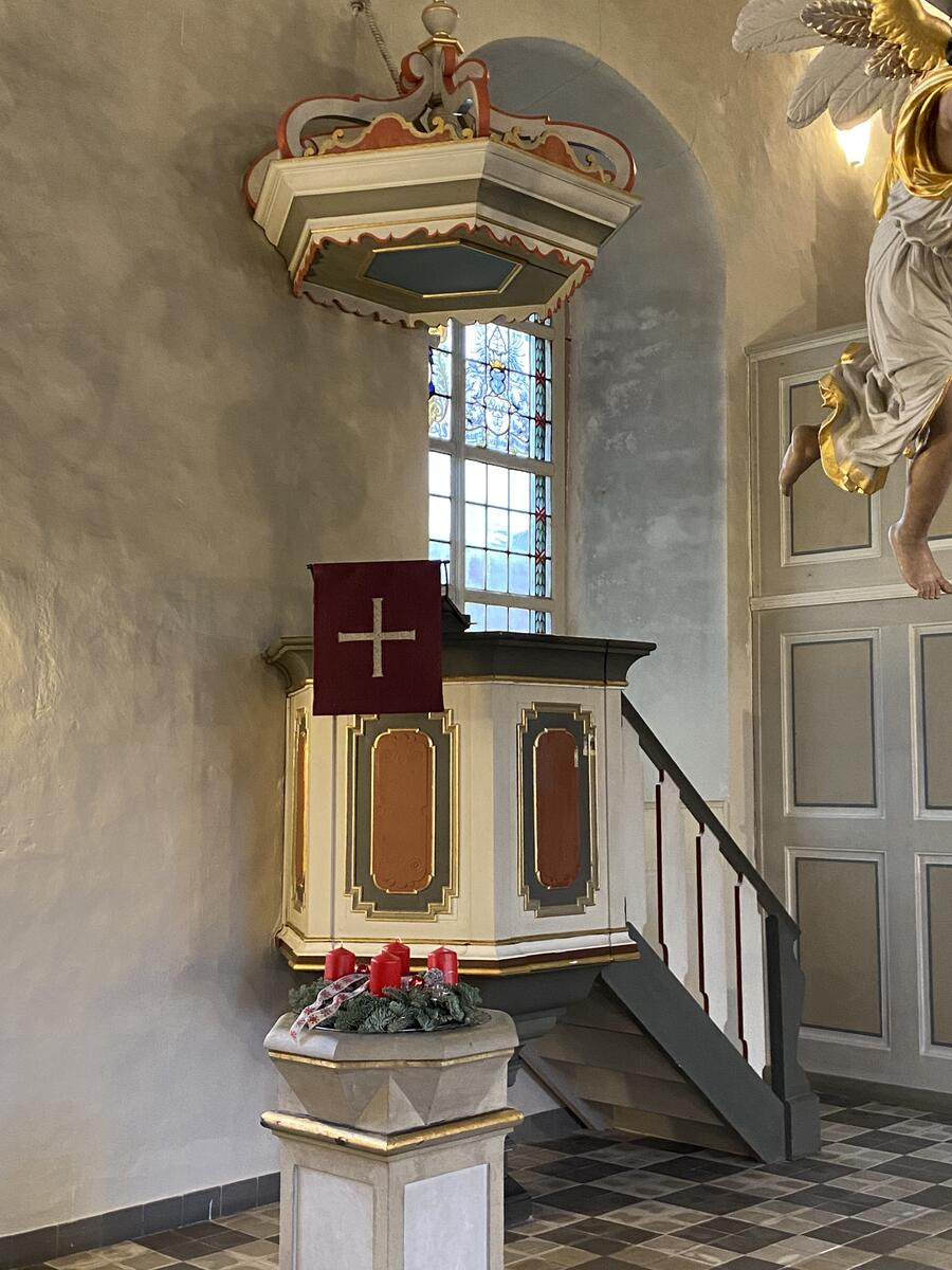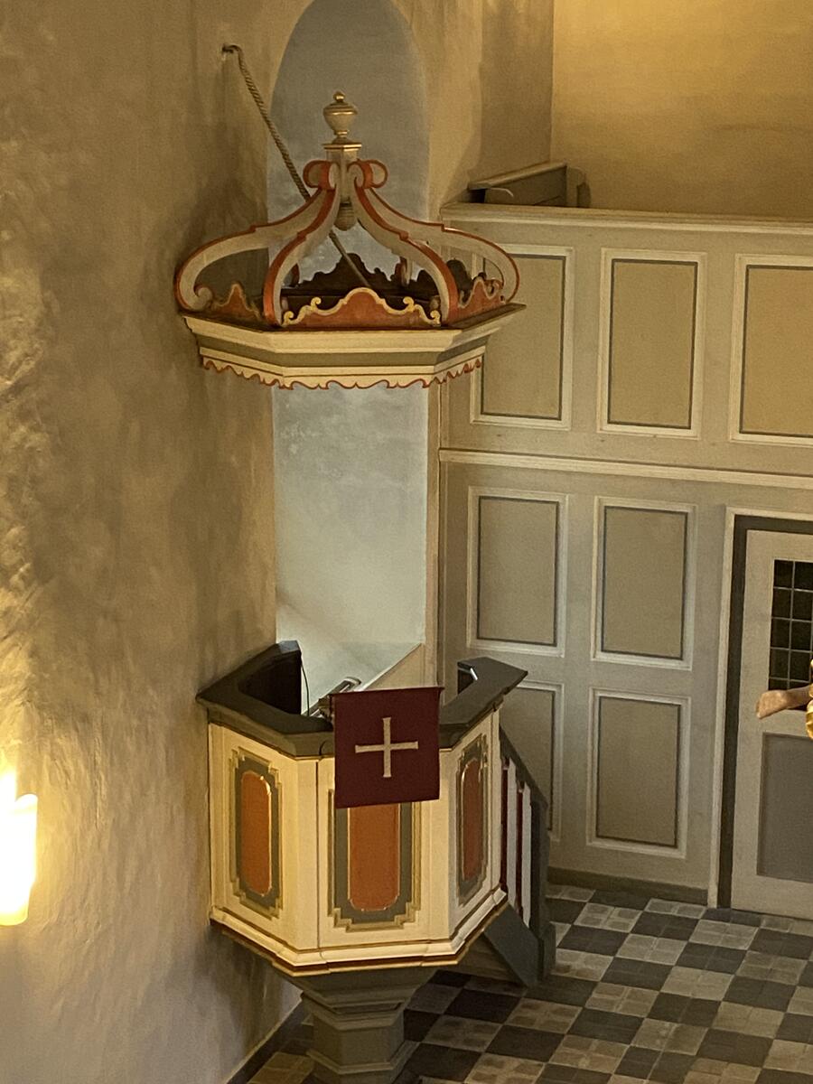 An der Nordwand der Kirche befindet sich eine Holzkanzel mit Schalldeckel, die aus der Zeit des Kirchenneubaus stammt.