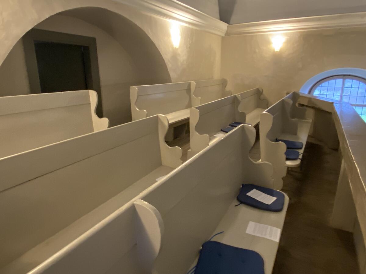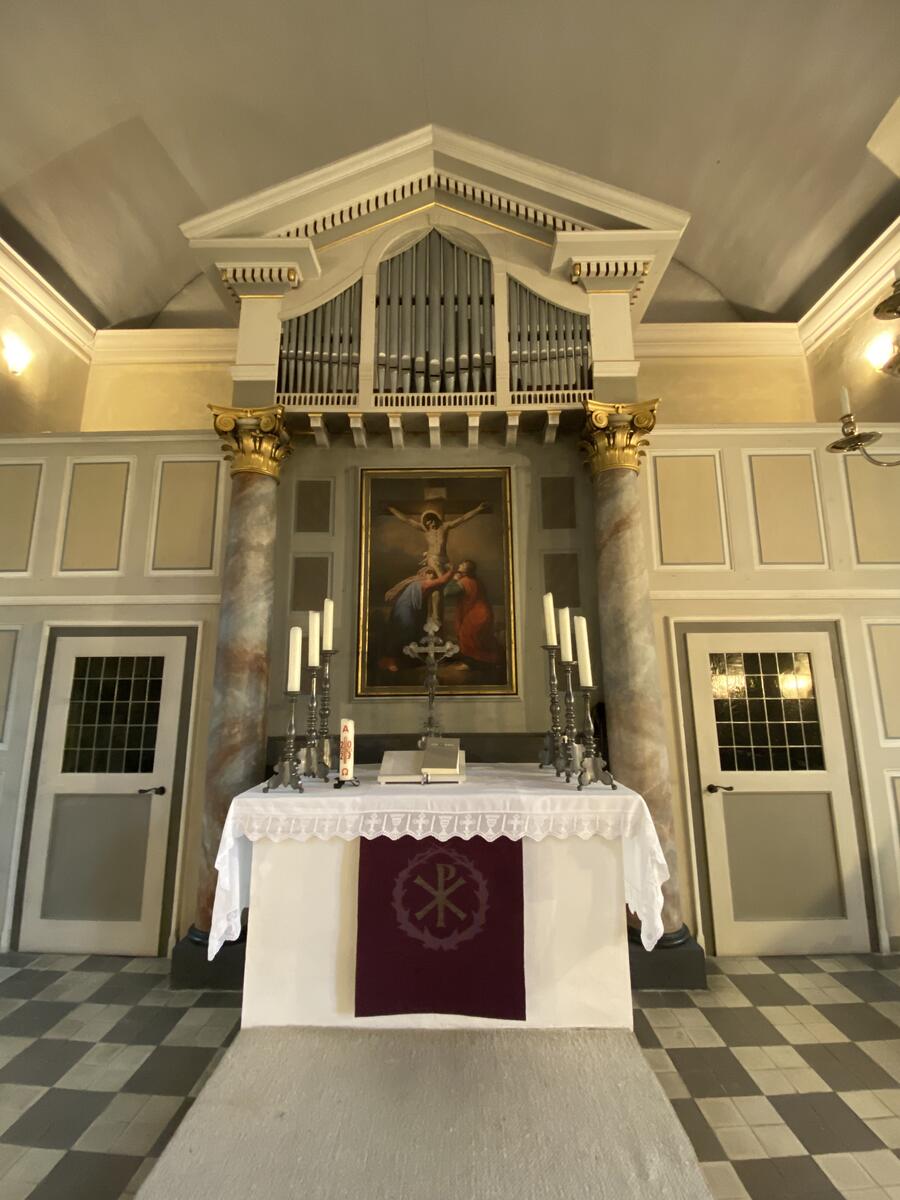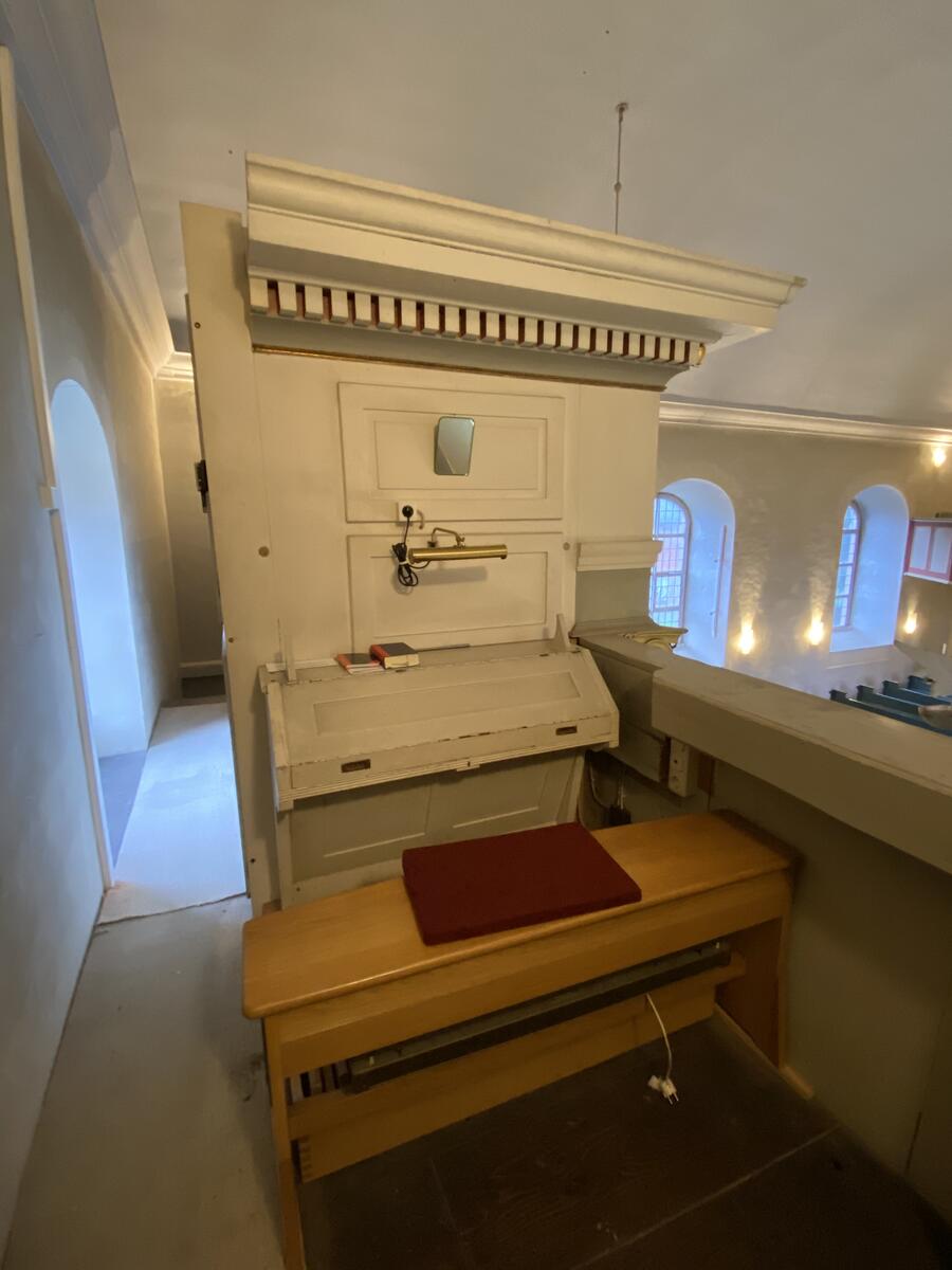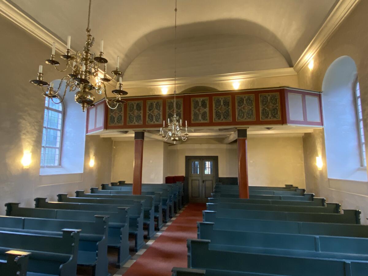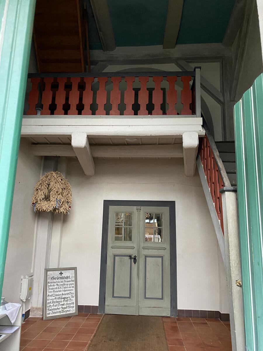 An der Nordwand der Kirche befindet sich eine Holzkanzel mit Schalldeckel, die aus der Zeit des Kirchenneubaus stammt.