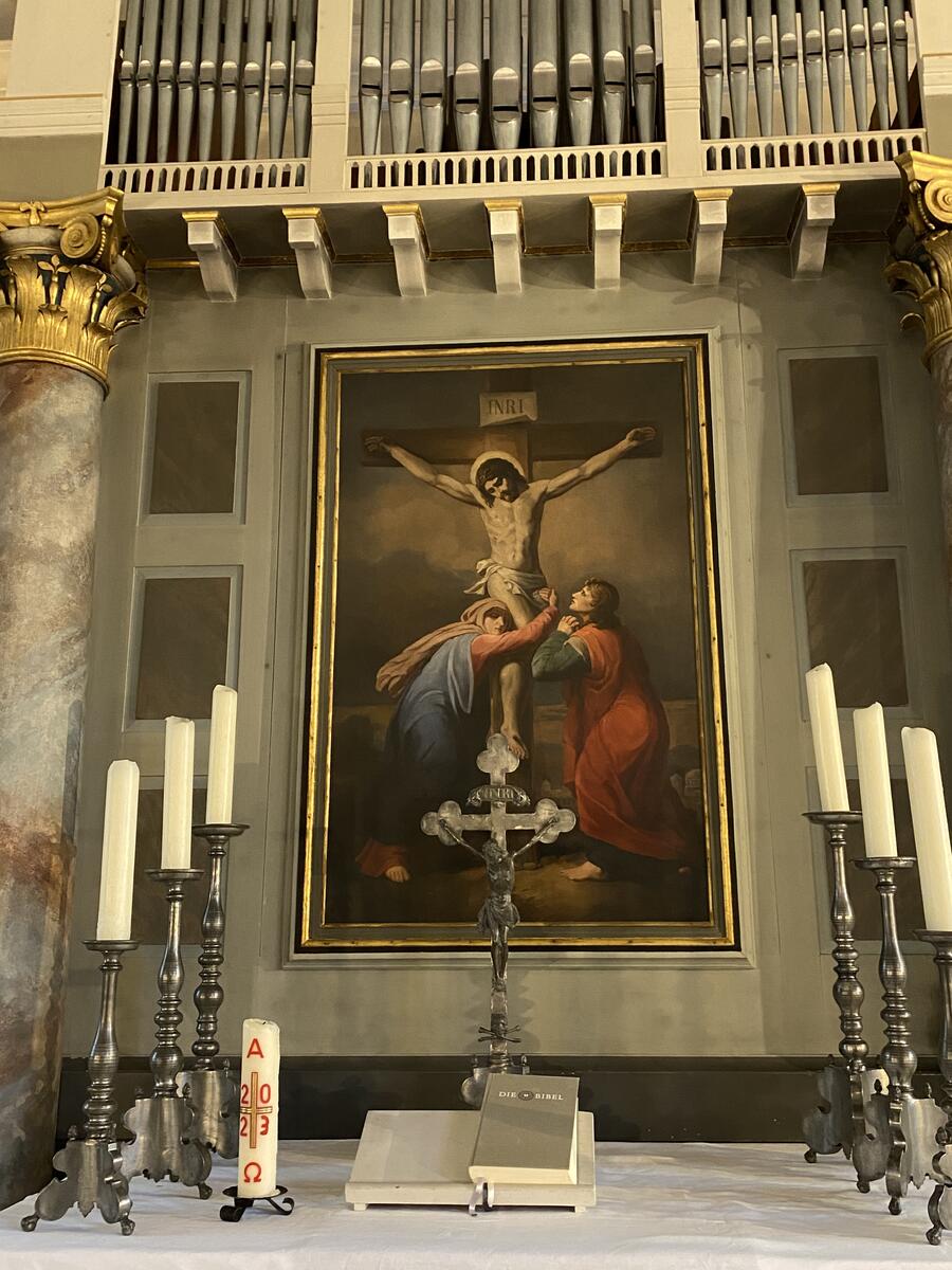 Im Inneren wird das schlicht gestaltete Kirchenschiff mit Emporen im Osten und Westen durch eine klassizistische Altarwand dominiert. Unter dem Altartisch aus Sandstein liegt, von außen nicht sichtbar, die Reliquiengruft verborgen. Das mit der Renovierung im Jahre 1912 neu angeschaffte Altarbild in Öl, das Maria und Johannes unter dem Kreuz zeigt, ist die Kopie eines Dresdner Gemäldes. An der Stelle der ursprünglich in die Altarwand integrierten Kanzel wurde 1838 unter dem Dreiecksgiebel eine Orgel aus der Werkstatt des Orgelbaumeisters Heinrich Schaper aus Alfeld eingebaut, die 1911 erstmalig und 1979 nochmals durch einen Neubau (Schmidt & Thiemann, Hannover) ersetzt wurde. Der alte Orgelprospekt blieb jedoch erhalten.