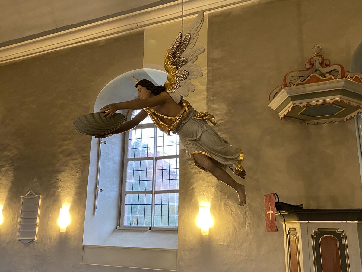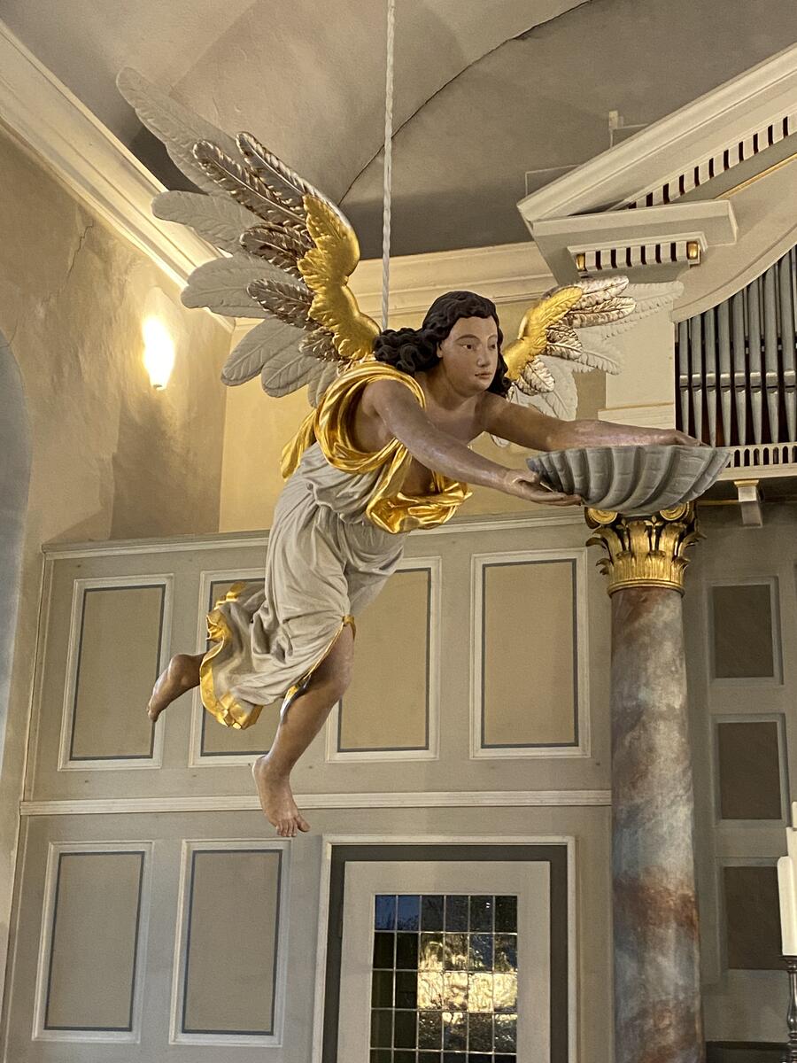 Ein um 1748 gefertigter Taufengel, der mit ausgestreckten Armen eine muschelförmige Taufschale hält, ist vermutlich eine Stiftung der Patronatsfamilie von Rauschenplat. Bis 1961 hing er ungenutzt in der Turmhalle, schwebt aber seit seiner Restaurierung im Jahre 1981 von der Decke des Ostchores und wird regelmäßig für Taufen genutzt.